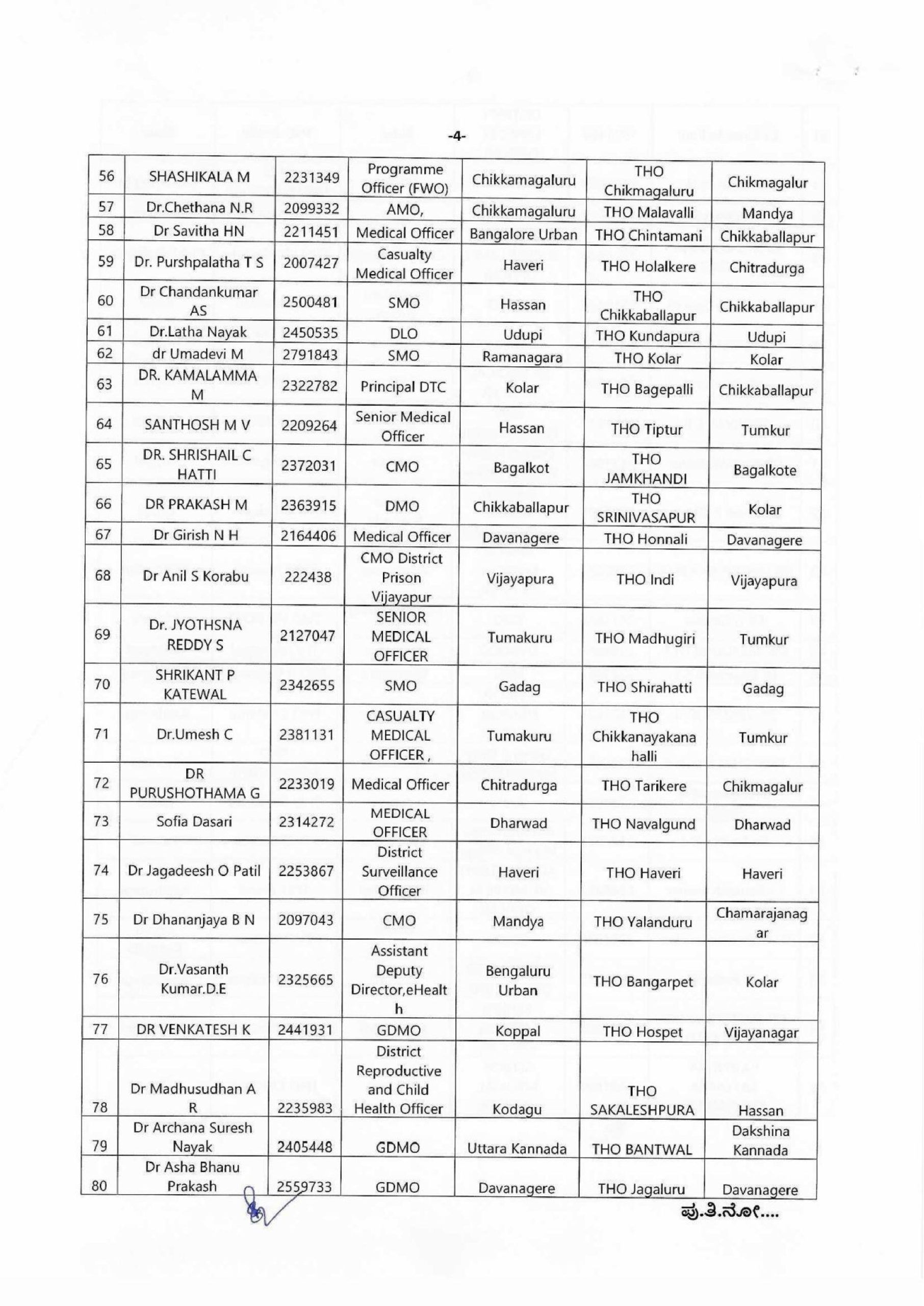 ಇನ್ನೂ ಶಿವಮೊಗ್ಗ ಟಿಹೆಚ್ಓ ಆಗಿ ಹಾವೇರಿಯ ಡಿಟಿಓ ನೀಲೇಶ್ ಎಂ.ಎನ್, ಶಿರಾ ಟಿಹೆಚ್ಓ ಆಗಿ ಡಾ.ಮಹೇಶ್.ಆರ್, ತುರುವೆಕೆರೆ ಟಿಹೆಚ್ಓ ಆಗಿ ಡಾ.ನವೀನ್ ಕುಮಾರ್.ಪಿಆರ್, ಹೊಸದುರ್ಗ ಟಿಹೆಚ್ಓ ಆಗಿ ರಂಗ ಸ್ವಾಮಿ ನಾಯ್ಕ್.ಎಂ, ತರೀಕೆರೆ ಟಿಹೆಚ್ಓ ಆಗಿ ಡಾ.ಪುರುಷೋತ್ತಮ ಜಿ, ಚಿಕ್ಕಬಳ್ಳಾಪುರ ಟಿಹೆಚ್ಓ ಆಗಿ ಡಾ.ಚಂದನ್ ಕುಮಾರ್.ಎಎಸ್ ನೇಮಿಸಿಲಾಗಿದೆ.