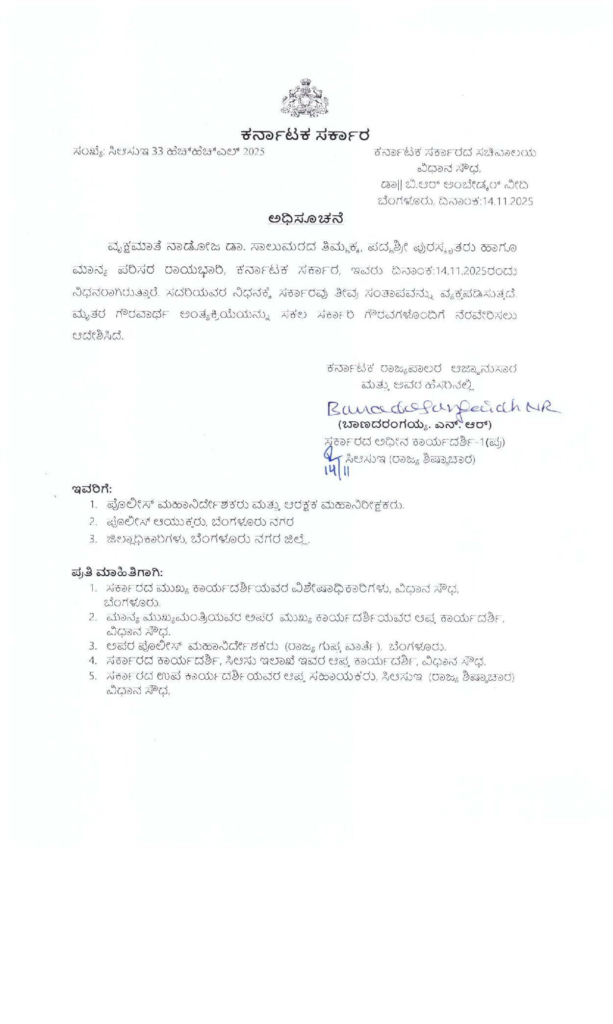 ಈ ಕುರಿತಂತೆ ಆಡಳಿತ ಮತ್ತು ಸಿಬ್ಬಂದಿ ಇಲಾಖೆಯ ಸರ್ಕಾರದ ಅಧೀನ ಕಾರ್ಯದರ್ಶಿ ಅಧಿಸೂಚನೆ ಹೊರಡಿಸಿದ್ದು, ವೃಕ್ಷಮಾತೆ ನಾಡೋಜ, ಪದ್ಮಶ್ರೀ ಪುರಸ್ಕೃತರು ಹಾಗೂ ಕರ್ನಾಟಕದ ಪರಿಸರ ರಾಯಭಾರಿ ಡಾ.ಸಾಲುಮರದ ತಿಮ್ಮಕ್ಕ ಅವರು ದಿನಾಂಕ 14-11-2025ರಂದು ನಿಧನರಾಗಿರುತ್ತಾರೆ. ಅವರ ನಿಧನಕ್ಕೆ ಸರ್ಕಾರವು ತೀವ್ರ ಸಂತಾಪವನ್ನು ವ್ಯಕ್ತಪಡಿಸುತ್ತದೆ ಎಂದಿದ್ದಾರೆ.