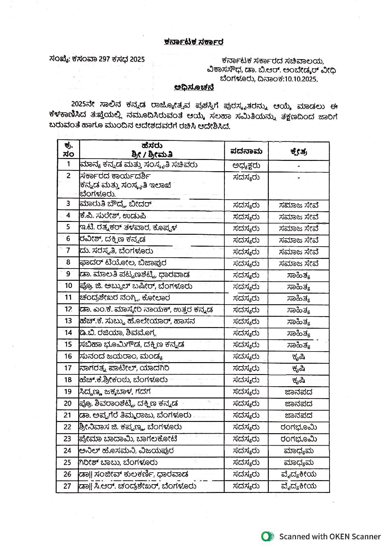 ಈ ಸಂಬಂಧ ಕನ್ನಡ ಮತ್ತು ಸಂಸ್ಕೃತಿ ಇಲಾಖೆಯ ಸರ್ಕಾರದ ಅಧೀನ ಕಾರ್ಯದರ್ಶಿ ಅಧಿಸೂಚನೆ ಹೊರಡಿಸಿದ್ದು, 2025ನೇ ಸಾಲಿನ ಕನ್ನಡ ರಾಜ್ಯೋತ್ಸವ ಪ್ರಶಸ್ತಿಗೆ ಪುರಸ್ಕೃತರನ್ನು ಆಯ್ಕೆ ಮಾಡಲು ಈ ಕೆಳಕಂಡ ಆಯ್ಕೆ ಸಲಹಾ ಸಮಿತಿಯನ್ನು ತಕ್ಷಣದಿಂದ ಜಾರಿಗೆ ಬರುವಂತೆ ಹಾಗೂ ಮುಂದಿನ ಆದೇಶದವರೆಗೆ ರಚಿಸಿ ಆದೇಶಿಸಿದ್ದಾರೆ.