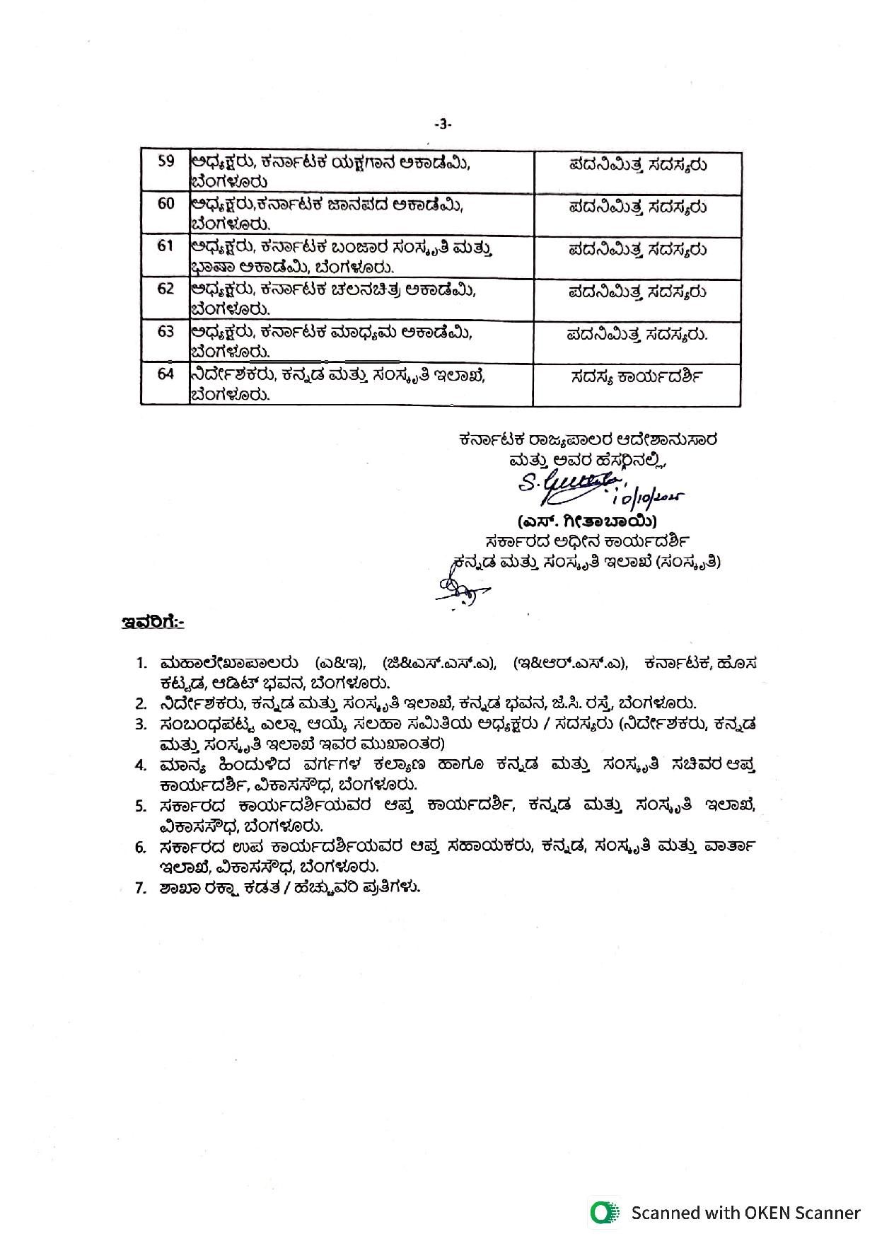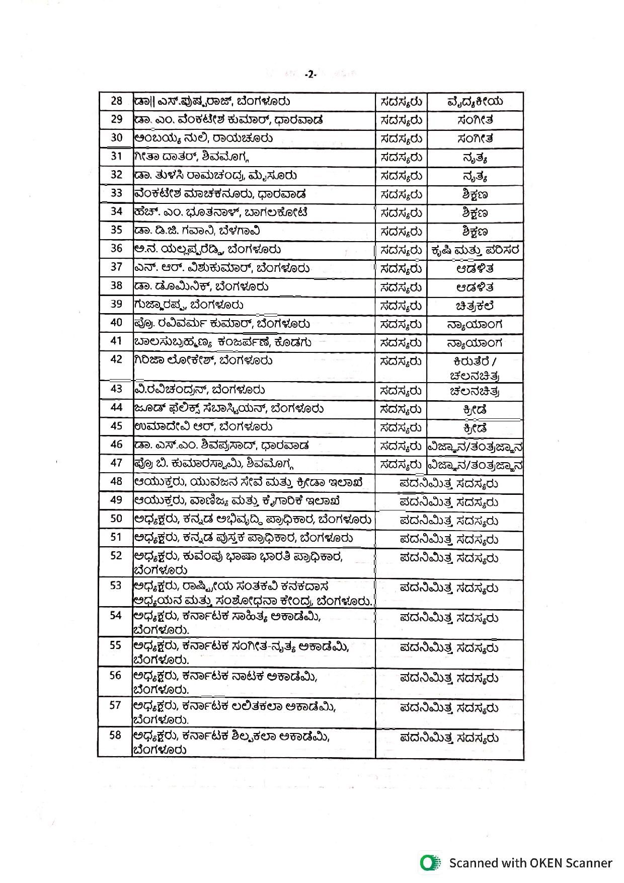 ಸಾಹಿತ್ಯ ಕ್ಷೇತ್ರದಿಂದ ಸದಸ್ಯರನ್ನಾಗಿ ಧಾರವಾಡದ ಡಾ.ಮಾಲತಿ ಪಟ್ಟಣಶೆಟ್ಟಿ, ಬೆಂಗಳೂರಿನ ಪ್ರೊ.ಜಿ.ಅಬ್ದುಲ್ ಬಷೀರ್, ಕೋಲಾರದ ಚಂದ್ರಶೇಖರ ನಂಗ್ಲಿ, ಉತ್ತರ ಕನ್ನಡದ ಡಾ.ಎಂಕೆ ಮಾಸ್ಕೇರಿ ನಾಯಕ್, ಹಾಸನದ ಹೆಚ್.ಕೆ ಸುಬ್ಬು ಹೊಲೇಯಾರ್, ಶಿವಮೊಗ್ಗದ ಡಿ.ಬಿ ರಜಿಯಾ, ದಕ್ಷಿಣ ಕನ್ನಡದ ಸಬಿಹಾ ಭೂಮಿಗೌಡ ಅವರನ್ನು ನೇಮಕ ಮಾಡಲಾಗಿದೆ.