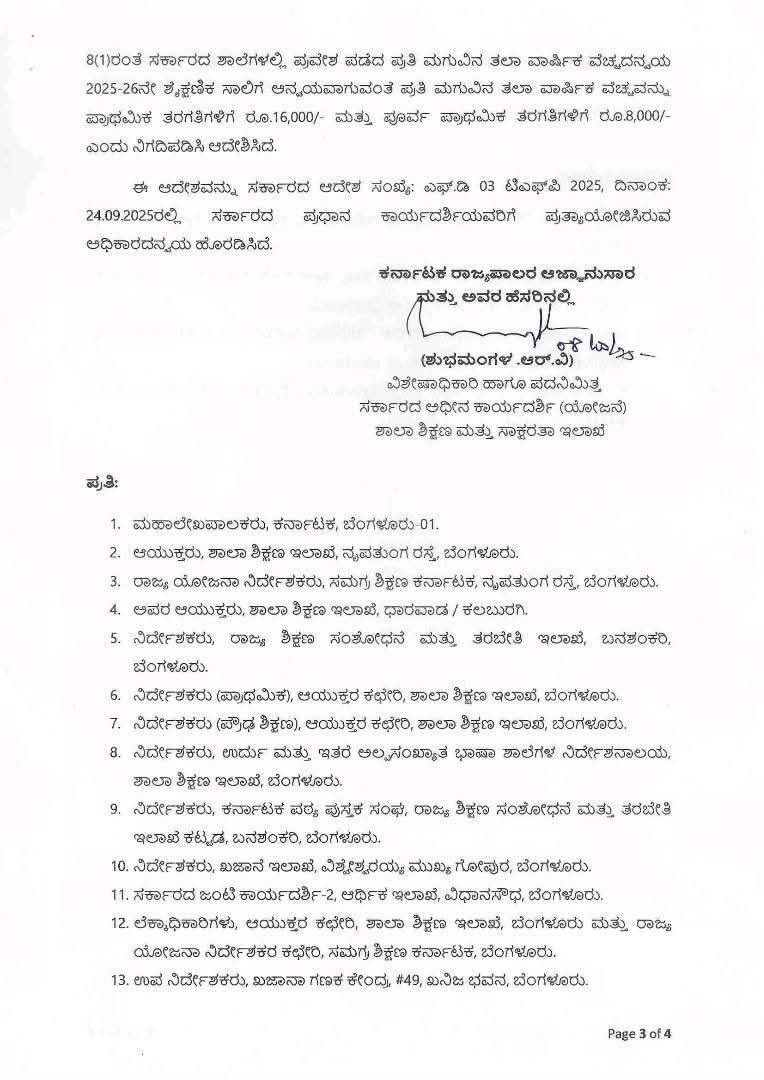8(1)ರಂತೆ ಸರ್ಕಾರದ ಶಾಲೆಗಳಲ್ಲಿ ಪ್ರವೇಶ ಪಡೆದ ಪ್ರತಿ ಮಗುವಿನ ತಲಾ ವಾರ್ಷಿಕ ವೆಚ್ಚದನ್ವಯ 2025-26ನೇ ಶೈಕ್ಷಣಿಕ ಸಾಲಿಗೆ ಅನ್ವಯವಾಗುವಂತೆ ಪ್ರತಿ ಮಗುವಿನ ತಲಾ ವಾರ್ಷಿಕ ವೆಚ್ಚವನ್ನು ಪ್ರಾಥಮಿಕ ತರಗತಿಗಳಿಗೆ ರೂ.16,000/- ಮತ್ತು ಪೂರ್ವ ಪ್ರಾಥಮಿಕ ತರಗತಿಗಳಿಗೆ ರೂ.8,000/-ಎಂದು ನಿಗದಿಪಡಿಸಿ ಆದೇಶಿಸಿದೆ.