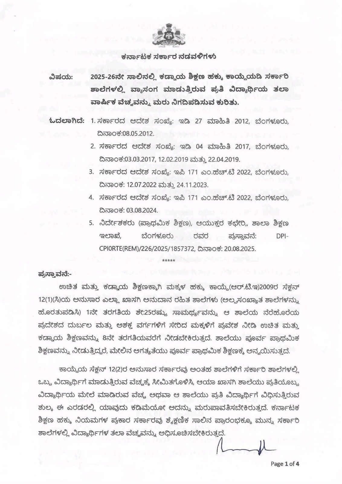 ಬೆಂಗಳೂರು : 2025-26ನೇ ಸಾಲಿನಲ್ಲಿ ಕಡ್ಡಾಯ ಶಿಕ್ಷಣ ಹಕ್ಕು ಕಾಯ್ದೆಯಡಿ ಸರ್ಕಾರಿ ಶಾಲೆಗಳಲ್ಲಿ ವ್ಯಾಸಂಗ ಮಾಡುತ್ತಿರುವ ಪ್ರತಿ ವಿದ್ಯಾರ್ಥಿಯ ತಲಾ ವಾರ್ಷಿಕ ವೆಚ್ಚವನ್ನು ಮರು ನಿಗದಿಪಡಿಸುವ ಕುರಿತು ರಾಜ್ಯ ಸರ್ಕಾರ ಆದೇಶ ಹೊರಡಿಸಿದೆ.