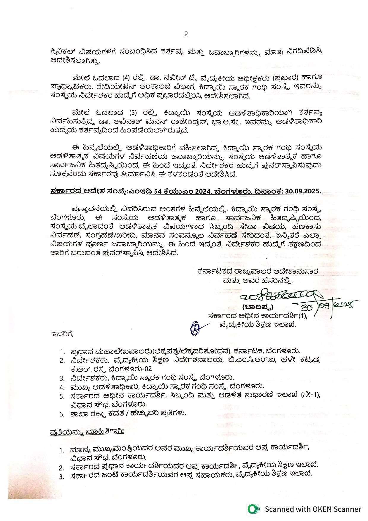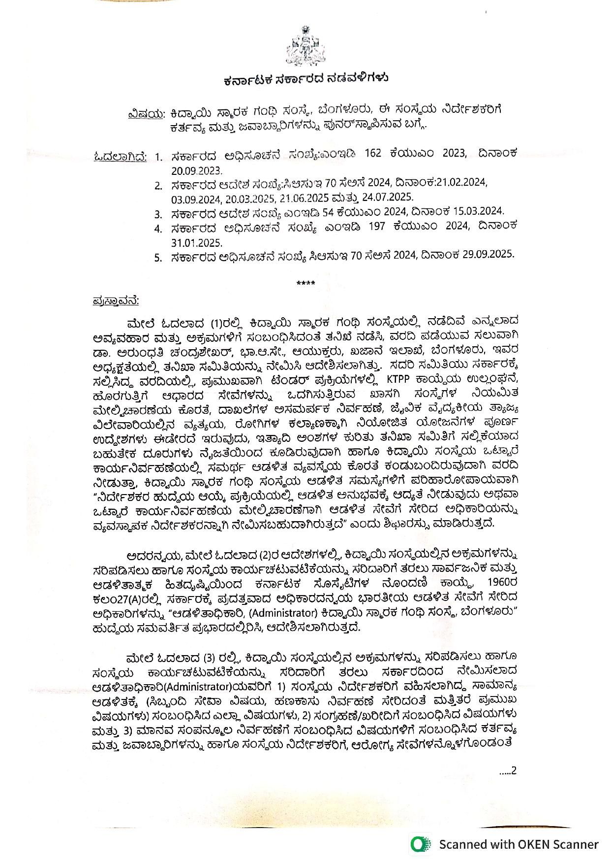 ಆಡಳಿತಾತ್ಮಕ ವಿಷಯ ಹಾಗೂ ಸಾರ್ವಜನಿಕ ಹಿತದೃಷ್ಟಿಯಿಂದ ಸಿಬ್ಬಂದಿ ಸೇವಾ ವಿಷಯ, ಹಣಕಾಸು ನಿರ್ವಹಣೆ, ಸಂಗ್ರಹಣೆ, ಖರೀದಿ, ಮಾನವ ಸಂಪನ್ಮೂಲ ನಿರ್ವಹಣೆ ಸೇರಿದಂತೆ ಎಲ್ಲಾ ಪೂರ್ಣ ಜವಾಬ್ದಾರಿಯನ್ನು ಈ ಹಿಂದೆ ಇದ್ದರಂತೆ ನಿರ್ದೇಶಕರಿಗೆ ಪುನಃ ಸ್ಥಾಪಿಸಿ ಆದೇಶ ಹೊರಡಿಸಲಾಗಿದೆ.