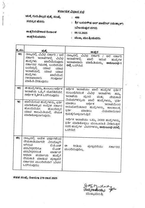 ಈ ಕುರಿತಂತೆ ವಿಧಾನಸಭೆಯಲ್ಲಿ ಶಾಸಕ ಬಸನಗೌಡ ಪಾಟೀಲ್ ಯತ್ನಾಳ್ ಅವರು ಮುಖ್ಯಮಂತ್ರಿ ಸಿದ್ಧರಾಮಯ್ಯ ಅವರಿಗೆ ಕೇಳಿದಂತ ಚುಕ್ಕೆ ಗುರುತಿಲ್ಲದ ಪ್ರಶ್ನೆಗೆ ಉತ್ತರಿಸಿದ್ದಾರೆ. ಅದರಲ್ಲಿ ಆರ್ಥಿಕ ಇಲಾಖೆಯು ಖಾಲಿ ಹುದ್ದೆಗಳ ಭರ್ತಿಗೆ ಸಂಬಂಧಿಸಿದಂತೆ ವಿವಿಧ ಇಲಾಖೆಗಳು ತಮ್ಮ ಇಲಾಖೆಯ ವೃಂದ ಮತ್ತು ನೇಮಕಾತಿ ನಿಯಮಗಳ ಅನ್ವಯ ಖಾಲಿ ಹುದ್ದೆಗಳನ್ನು ಭರ್ತಿ ಮಾಡಲು ಅನುಮೋದಿಸಿದೆ ಎಂದಿದ್ದಾರೆ.
