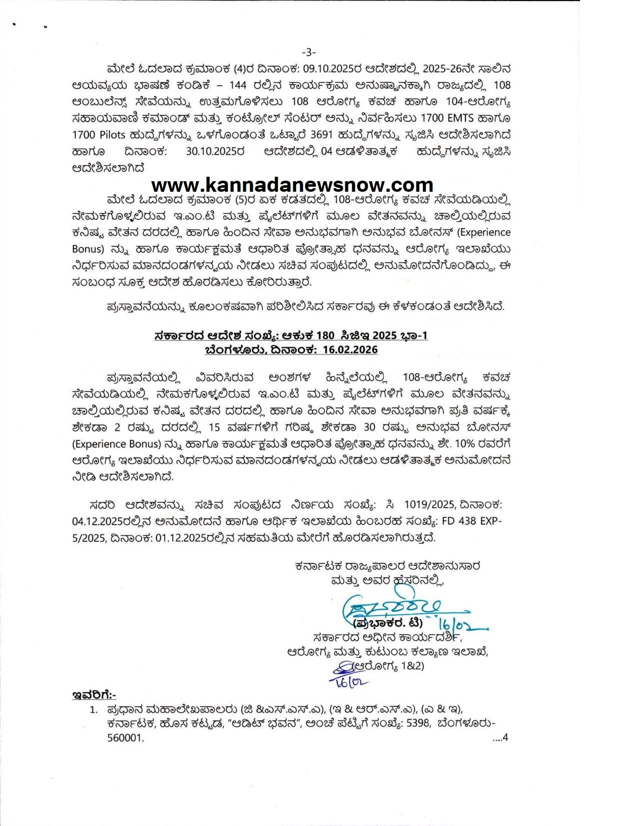 ದಿನಾಂಕ: 09.10.2025ರ ಆದೇಶದಲ್ಲಿ 2025-26ನೇ ಸಾಲಿನ ಆಯವ್ಯಯ ಭಾಷಣೆ ಕಂಡಿಕೆ 144 ರಲ್ಲಿನ ಕಾರ್ಯಕ್ರಮ ಅನುಷ್ಠಾನಕ್ಕಾಗಿ ರಾಜ್ಯದಲ್ಲಿ 108 ಆಂಬುಲೆನ್ಸ್ ಸೇವೆಯನ್ನು ಉತ್ತಮಗೊಳಿಸಲು 108 ಆರೋಗ್ಯ ಕವಚ ಹಾಗೂ 104-ಆರೋಗ್ಯ ಸಹಾಯವಾಣಿ ಕಮಾಂಡ್ ಮತ್ತು ಕಂಟ್ರೋಲ್ ಸೆಂಟರ್ ಅನ್ನು ನಿರ್ವಹಿಸಲು 1700 EMTS ಹಾಗೂ 1700 Pilots ಹುದ್ದೆಗಳನ್ನು ಒಳಗೊಂಡಂತೆ ಒಟ್ಟಾರೆ 3691 ಹುದ್ದೆಗಳನ್ನು ಸೃಜಿಸಿ ಆದೇಶಿಸಲಾಗಿದೆ ಹಾಗೂ ದಿನಾಂಕ: 30.10.20250 ಆದೇಶದಲ್ಲಿ 04 ಆಡಳಿತಾತ್ಮಕ ಹುದ್ದೆಗಳನ್ನು ಸೃಜಿಸಿ ಆದೇಶಿಸಲಾಗಿದೆ