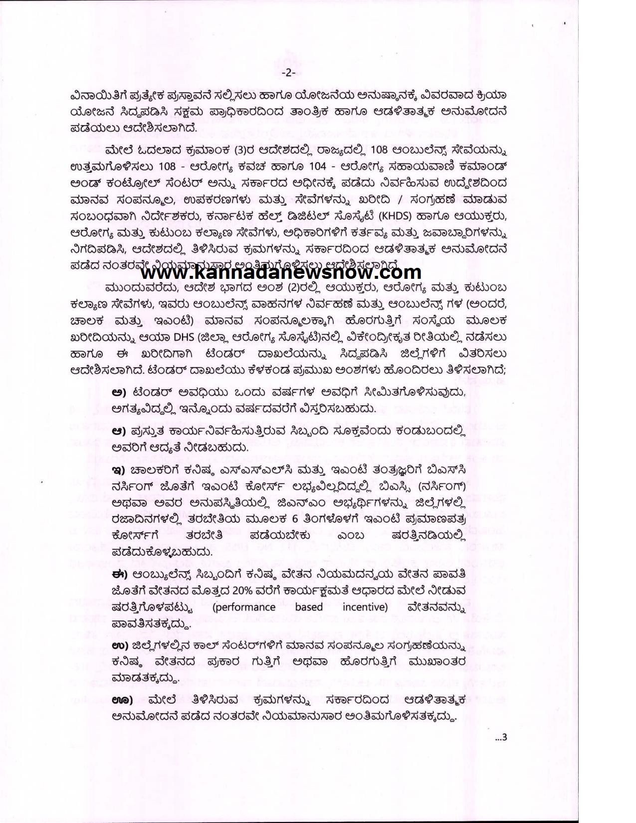 ರಾಜ್ಯದಲ್ಲಿ 108 ಆಂಬುಲೆನ್ಸ್ ಸೇವೆಯನ್ನು ಉತ್ತಮಗೊಳಿಸಲು 108 – ಆರೋಗ್ಯ ಕವಚ ಹಾಗೂ 104 – ಆರೋಗ್ಯ ಸಹಾಯವಾಣಿ ಕಮಾಂಡ್ ಅಂಡ್ ಕಂಟ್ರೋಲ್ ಸೆಂಟರ್ ಅನ್ನು ಸರ್ಕಾರದ ಅಧೀನಕ್ಕೆ ಪಡೆದು ನಿರ್ವಹಿಸುವ ಉದ್ದೇಶದಿಂದ ಮಾನವ ಸಂಪನ್ಮೂಲ, ಉಪಕರಣಗಳು ಮತ್ತು ಸೇವೆಗಳನ್ನು ಖರೀದಿ / ಸಂಗ್ರಹಣೆ ಮಾಡುವ ಸಂಬಂಧವಾಗಿ ನಿರ್ದೇಶಕರು, ಕರ್ನಾಟಕ ಹೆಲ್ ಡಿಜಿಟಲ್ ಸೊಸೈಟಿ (KHDS) ಹಾಗೂ ಆಯುಕ್ತರು, ಆರೋಗ್ಯ ಮತ್ತು ಕುಟುಂಬ ಕಲ್ಯಾಣ ಸೇವೆಗಳು, ಅಧಿಕಾರಿಗಳಿಗೆ ಕರ್ತವ್ಯ ಮತ್ತು ಜವಾಬ್ದಾರಿಗಳನ್ನು ನಿಗದಿಪಡಿಸಿ, ಆದೇಶದಲ್ಲಿ ತಿಳಿಸಿರುವ ಕ್ರಮಗಳನ್ನು ಸರ್ಕಾರದಿಂದ ಆಡಳಿತಾತ್ಮಕ ಅನುಮೋದನೆ ಪಡೆದ ನಂತರವೇ ನಿಯಮಾನುಸಾರ ಅಂತಿಮಗೊಳಿಸಲು ಆದೇಶಿಸಲಾಗಿದೆ.