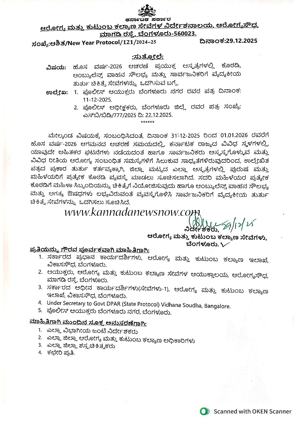 ಬೆಂಗಳೂರು: ಹೊಸ ವರ್ಷ-2026 ಆಚರಣೆ ಪ್ರಯುಕ್ತ ಆಸ್ಪತ್ರೆಗಳಲ್ಲಿ ಕೊಠಡಿ, ಆಂಬ್ಯುಲೆನ್ಸ್ ವಾಹನ ಸೌಲಭ್ಯ ಮತ್ತು ಸಾರ್ವಜನಿಕರಿಗೆ ವೈದ್ಯಕೀಯ ತುರ್ತು ಚಿಕಿತ್ಸೆ ಸೇವೆಗಳನ್ನು ಒದಗಿಸೋದಕ್ಕೆ ರಾಜ್ಯ ಸರ್ಕಾರ ಖಡಕ್ ಆದೇಶ ಮಾಡಿದೆ.