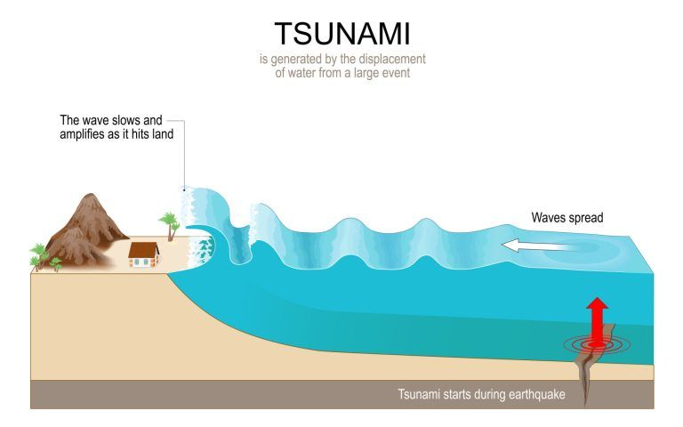 Tsunami is a series of huge waves that generated by submarine earthquakes. Waves travel at subsonic speed across the water surface. Vector diagram. poster for education