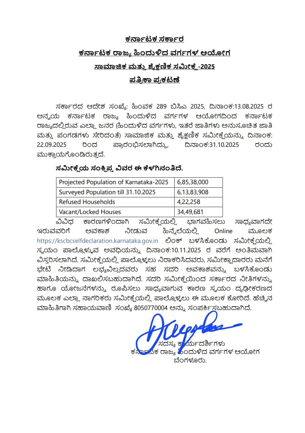 ಈ ಬಗ್ಗೆ ರಾಜ್ಯ ಹಿಂದುಳಿದ ವರ್ಗಗಳ ಆಯೋಗದಿಂದ ಪತ್ರಿಕಾ ಪ್ರಕಟಣೆಯಲ್ಲಿ ಮಾಹಿತಿ ನೀಡಿದ್ದು, ಸರ್ಕಾರದ ಆದೇಶ ಸಂಖ್ಯೆ: ಹಿಂವಕ 289 ಬಿಸಿಎ 2025, ದಿನಾಂಕ:13.08.2025 ರ ಅನ್ವಯ ಕರ್ನಾಟಕ ರಾಜ್ಯ ಹಿಂದುಳಿದ ವರ್ಗಗಳ ಆಯೋಗದಿಂದ ಕರ್ನಾಟಕ ರಾಜ್ಯದಲ್ಲಿರುವ ಎಲ್ಲಾ ಜನರ (ಹಿಂದುಳಿದ ವರ್ಗಗಳು, ಇತರೆ ಜಾತಿಗಳು ಅನುಸೂಚಿತ ಜಾತಿ ಮತ್ತು ಪಂಗಡಗಳು ಸೇರಿದಂತೆ) ಸಾಮಾಜಿಕ ಮತ್ತು ಶೈಕ್ಷಣಿಕ ಸಮೀಕ್ಷೆಯನ್ನು ದಿನಾಂಕ:22-09-2025 ರಿಂದ ಪ್ರಾರಂಭಿಸಲಾಗಿದ್ದು, ದಿನಾಂಕ 31.10.2025 ಮುಕ್ತಾಯಗೊಂಡಿರುತ್ತದೆ ಎಂದಿದೆ.