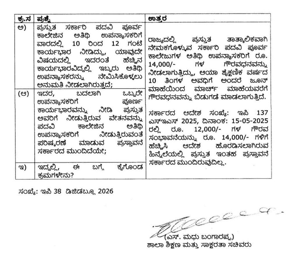 ಬೆಂಗಳೂರು: ರಾಜ್ಯದ ಸರ್ಕಾರಿ ಪದವಿ ಪೂರ್ವ ಕಾಲೇಜುಗಳಲ್ಲಿ ತಾತ್ಕಾಲಿಕವಾಗಿ ಕಾರ್ಯನಿರ್ವಹಿಸುತ್ತಿರುವ ಅತಿಥಿ ಉಪನ್ಯಾಸಕರಿಗೆ ಸಂಬಂಧಿಸಿದಂತೆ ಶಿಕ್ಷಣ ಇಲಾಖೆಯು ಮಹತ್ವದ ಮಾಹಿತಿಯನ್ನು ಹೊರಹಾಕಿದೆ. ಅತಿಥಿ ಉಪನ್ಯಾಸಕರ ಕಾರ್ಯಭಾರ ಮತ್ತು ಗೌರವಧನಕ್ಕೆ ಸಂಬಂಧಿಸಿದಂತೆ ಕೇಳಲಾದ ಪ್ರಶ್ನೆಗಳಿಗೆ ಶಾಲಾ ಶಿಕ್ಷಣ ಮತ್ತು ಸಾಕ್ಷರತಾ ಸಚಿವರಾದ ಎಸ್. ಮಧು ಬಂಗಾರಪ್ಪ ಅವರು ಲಿಖಿತ ಉತ್ತರ ನೀಡಿದ್ದಾರೆ.