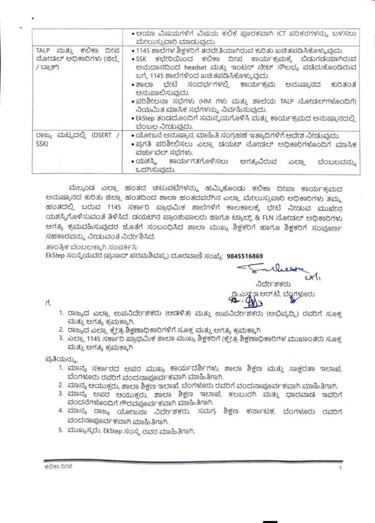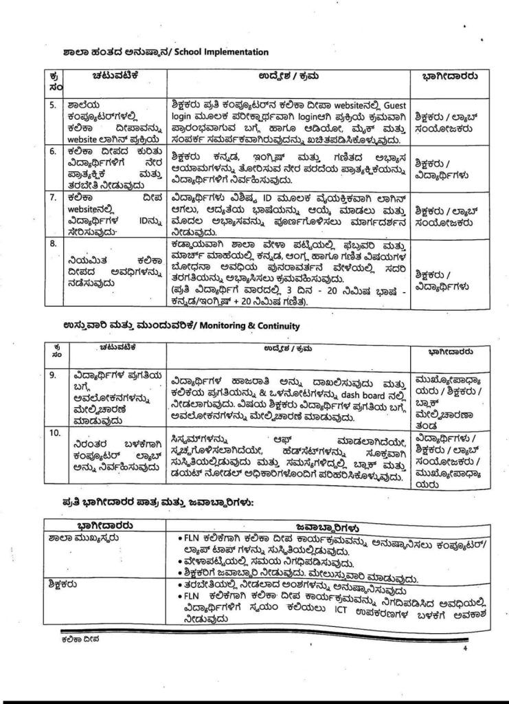 ಯೋಜನೆಯ ಉಸ್ತುವಾರಿಗಾಗಿ ಜಿಲ್ಲಾ ಮಟ್ಟದಲ್ಲಿ TALP ಮತ್ತು ಕಲಿಕಾ ದೀಪ ನೋಡಲ್ ಅಧಿಕಾರಿ, ತಾಲೂಕು ಮಟ್ಟದಲ್ಲಿ BRP ಹಾಗೂ ಶಾಲಾ ಹಂತದಲ್ಲಿ ಒಬ್ಬ ಶಿಕ್ಷಕರನ್ನು ನೋಡಲ್ ಅಧಿಕಾರಿಯಾಗಿ ನೇಮಿಸಲಾಗುತ್ತದೆ. ವಾಟ್ಸ್ಯಾಪ್ ಗ್ರೂಪ್ಗಳನ್ನು ರಚಿಸಿ, ವಿಡಿಯೋ ಕ್ಲಿಪ್ ಮತ್ತು ಪಿಪಿಟಿಗಳ ಮೂಲಕ ಶಿಕ್ಷಕರಿಗೆ ನಿರಂತರ ಮಾರ್ಗದರ್ಶನ ನೀಡಲು ಇಲಾಖೆ ಸಕಲ ಸಿದ್ಧತೆ ಮಾಡಿಕೊಂಡಿದೆ.
