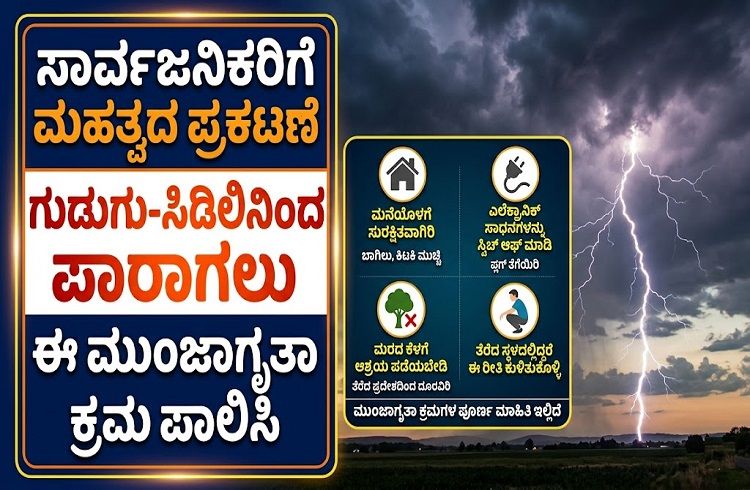 ಬೆಂಗಳೂರು : ರಾಷ್ಟ್ರೀಯ ವಿಪತ್ತು ನಿರ್ವಹಣಾ ಪ್ರಾಧಿಕಾರವು ಗುಡುಗು ಮತ್ತು ಸಿಡಿಲು ಬಡಿತದಿಂದ ಉಂಟಾಗುವ ಪ್ರತಿಕೂಲ ಪರಿಣಾಮಗಳನ್ನು ತಗ್ಗಿಸಲು ಪ್ರಾಧಿಕಾರದಿಂದ ಗುಡುಗು ಮತ್ತು ಸಿಡಿಲು ಬಡಿತ ಪ್ರತಿಕೂಲ ಪರಿಣಾಮಗಳನ್ನು ತಗ್ಗಿಸಲು ಮಾರ್ಗಸೂಚಿಗಳನ್ನು ಹೊರಡಿಸಿದ್ದು, ಸಾರ್ವಜನಿಕರು ಅವುಗಳನ್ನು ಕಡ್ಡಾಯವಾಗಿ ಪಾಲಿಸಿ, ನೈಸರ್ಗಿಕ ಅವಘಡಗಳಿಂದ ಆಗುವ ಹಾನಿಯಿಂದಾಗಿ ತಪ್ಪಿಸಿಕೊಳ್ಳಬಹುದಾಗಿದೆ.ಹಾಗಾದ್ರೇ ಗುಡುಗು ಸಹಿತ ಮಳೆ ಬರುವಾಗ ಸಿಡಿಲಿನಿಂದ ರಕ್ಷಿಸಲು ಈ ಕೆಳಗಿನ ಮುನ್ನೆಚ್ಚರಿಕೆ ಕ್ರಮಗಳನ್ನು ತಪ್ಪದೇ ಪಾಲಿಸಿ.