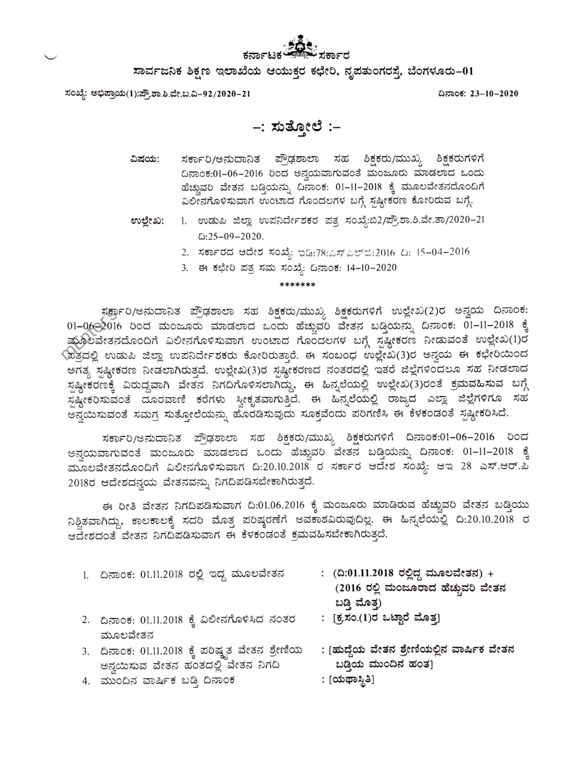 ಸರ್ಕಾರಿ/ಅನುದಾನಿತ ಪ್ರೌಢಶಾಲಾ ಸಹ ಶಿಕ್ಷಕರು/ಮುಖ್ಯ ಶಿಕ್ಷಕರುಗಳಿಗೆ ಉಲ್ಲೇಖ(2)ರ ಅನ್ವಯ ದಿನಾಂಕ: 01-06-2016 ರಿಂದ ಮಂಜೂರು ಮಾಡಲಾದ ಒಂದು ಹೆಚ್ಚುವರಿ ವೇತನ ಬಡ್ತಿಯನ್ನು ದಿನಾಂಕ: 01-11-2018 ಲವೇತನದೊಂದಿಗೆ ವಿಲೀನಗೊಳಿಸುವಾಗ ಉಂಟಾದ ಗೊಂದಲಗಳ ಬಗ್ಗೆ ಸ್ಪಷ್ಟಿಕರಣ ನೀಡುವಂತೆ ಉಲ್ಲೇಖ(1)ರ ಉಡುಪಿ ಜಿಲ್ಲಾ ಉಪನಿರ್ದೇಶಕರು ಕೋರಿರುತ್ತಾರೆ. ಈ ಸಂಬಂಧ ಉಲ್ಲೇಖ(3)ರ ಅನ್ವಯ ಈ ಕಛೇರಿಯಿಂದ ಅಗತ್ಯ ಸ್ಪಷ್ಟಿಕರಣ ನೀಡಲಾಗಿರುತ್ತದೆ. ಉಲ್ಲೇಖ(3)ರ ಸ್ಪಷ್ಟಿಕರಣದ ನಂತರದಲ್ಲಿ ಇತರೆ ಜಿಲ್ಲೆಗಳಿಂದಲೂ ಸಹ ನೀಡಲಾದ ಸ್ಪಷ್ಟಿಕರಣಕ್ಕೆ ವಿರುದ್ಧವಾಗಿ ವೇತನ ನಿಗದಿಗೊಳಿಸಲಾಗಿದ್ದು, ಈ ಹಿನ್ನಲೆಯಲ್ಲಿ ಉಲ್ಲೇಖ(3)ರಂತೆ ಕ್ರಮವಹಿಸುವ ಬಗ್ಗೆ ಸ್ಪಷ್ಠಿಕರಿಸುವಂತೆ ದೂರವಾಣಿ ಕರೆಗಳು ಸ್ವೀಕೃತವಾಗುತ್ತಿದೆ. ಈ ಹಿನ್ನಲೆಯಲ್ಲಿ ರಾಜ್ಯದ ಎಲ್ಲಾ ಜಿಲ್ಲೆಗಳಿಗೂ ಸಹ ಅನ್ವಯಿಸುವಂತೆ ಸಮಗ್ರ ಸುತ್ತೋಲೆಯನ್ನು ಹೊರಡಿಸುವುದು ಸೂಕ್ತವೆಂದು ಪರಿಗಣಿಸಿ ಈ ಕೆಳಕಂಡಂತೆ ಸ್ಪಷ್ಟಿಕರಿಸಿದೆ ಎಂದಿದ್ದಾರೆ.