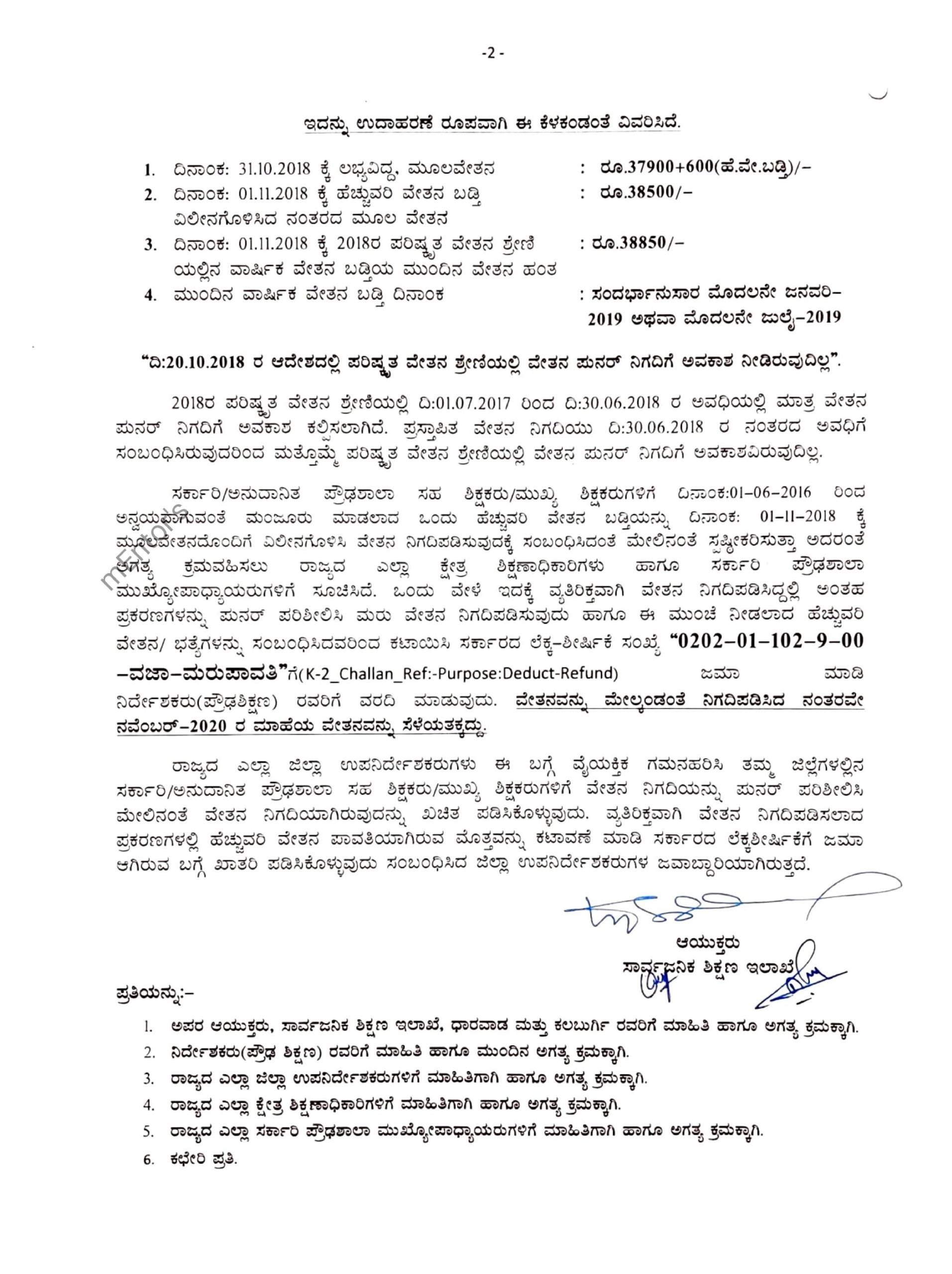 ಪ್ರಸ್ತಾಪಿತ ವೇತನ ನಿಗದಿಯು ದಿ:30.06.2018 ರ ನಂತರದ ಅವಧಿಗೆ ಸಂಬಂಧಿಸಿರುವುದರಿಂದ ಮತ್ತೊಮ್ಮೆ ಪರಿಷ್ಕೃತ ವೇತನ ಶ್ರೇಣಿಯಲ್ಲಿ ವೇತನ ಪುನ ನಿಗದಿಗೆ ಅವಕಾಶವಿರುವುದಿಲ್ಲ. ಸರ್ಕಾರಿ/ಅನುದಾನಿತ ಪ್ರೌಢಶಾಲಾ ಸಹ ಶಿಕ್ಷಕರು/ಮುಖ್ಯ ಶಿಕ್ಷಕರುಗಳಿಗೆ ದಿನಾಂಕ:01-06-2016 ಅನ್ವಯವಾಗುವಂತೆ ಮಂಜೂರು ಮಾಡಲಾದ ಒಂದು ಹೆಚ್ಚುವರಿ ವೇತನ ಬಡ್ತಿಯನ್ನು ದಿನಾಂಕ: 01-II-2018 ವೇತನದೊಂದಿಗೆ ವಿಲೀನಗೊಳಿಸಿ ವೇತನ ನಿಗದಿಪಡಿಸುವುದಕ್ಕೆ ಸಂಬಂಧಿಸಿದಂತೆ ಮೇಲಿನಂತೆ ಸ್ಪಷ್ಠಿಕರಿಸುತ್ತಾ ಅದರಂತೆ ಮುಖ್ಯೋಪಾಧ್ಯಾಯರುಗಳಿಗೆ ಸೂಚಿಸಿದೆ. ಒಂದು ವೇಳೆ ಇದಕ್ಕೆ ವ್ಯತಿರಿಕ್ತವಾಗಿ ವೇತನ ನಿಗದಿಪಡಿಸಿದ್ದಲ್ಲಿ ಅಂತಹ ಪ್ರಕರಣಗಳನ್ನು ಪುನರ್ ಪರಿಶೀಲಿಸಿ ಮರು ವೇತನ ನಿಗದಿಪಡಿಸುವುದು ಹಾಗೂ ಈ ಮುಂಚೆ ನೀಡಲಾದ ಹೆಚ್ಚುವರಿ ವೇತನ/ ಭತ್ಯೆಗಳನ್ನು ಸಂಬಂಧಿಸಿದವರಿಂದ ಕಟಾಯಿಸಿ ಸರ್ಕಾರದ ಲೆಕ್ಕ-ಶೀರ್ಷಿಕೆ ಸಂಖ್ಯೆ “0202-01-102-9-00 -LED-BBB”(K-2_Challan_Ref:-Purpose: Deduct-Refund) ಜಮಾ ಮಾಡಿ ನಿರ್ದೇಶಕರು(ಪ್ರೌಢಶಿಕ್ಷಣ) ರವರಿಗೆ ವರದಿ ಮಾಡುವುದು. ವೇತನವನ್ನು ಮೇಲ್ಕಂಡಂತೆ ನಿಗದಿಪಡಿಸಿದ ನಂತರವೇ ನವೆಂಬರ್-2020 ರ ಮಾಹೆಯ ವೇತನವನ್ನು ಸೆಳೆಯತಕ್ಕದ್ದು.
