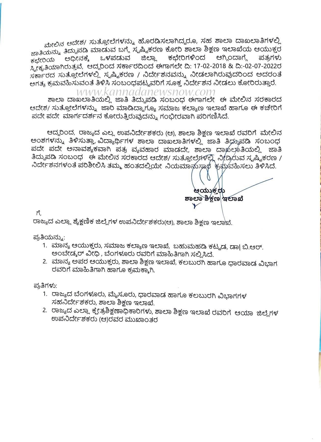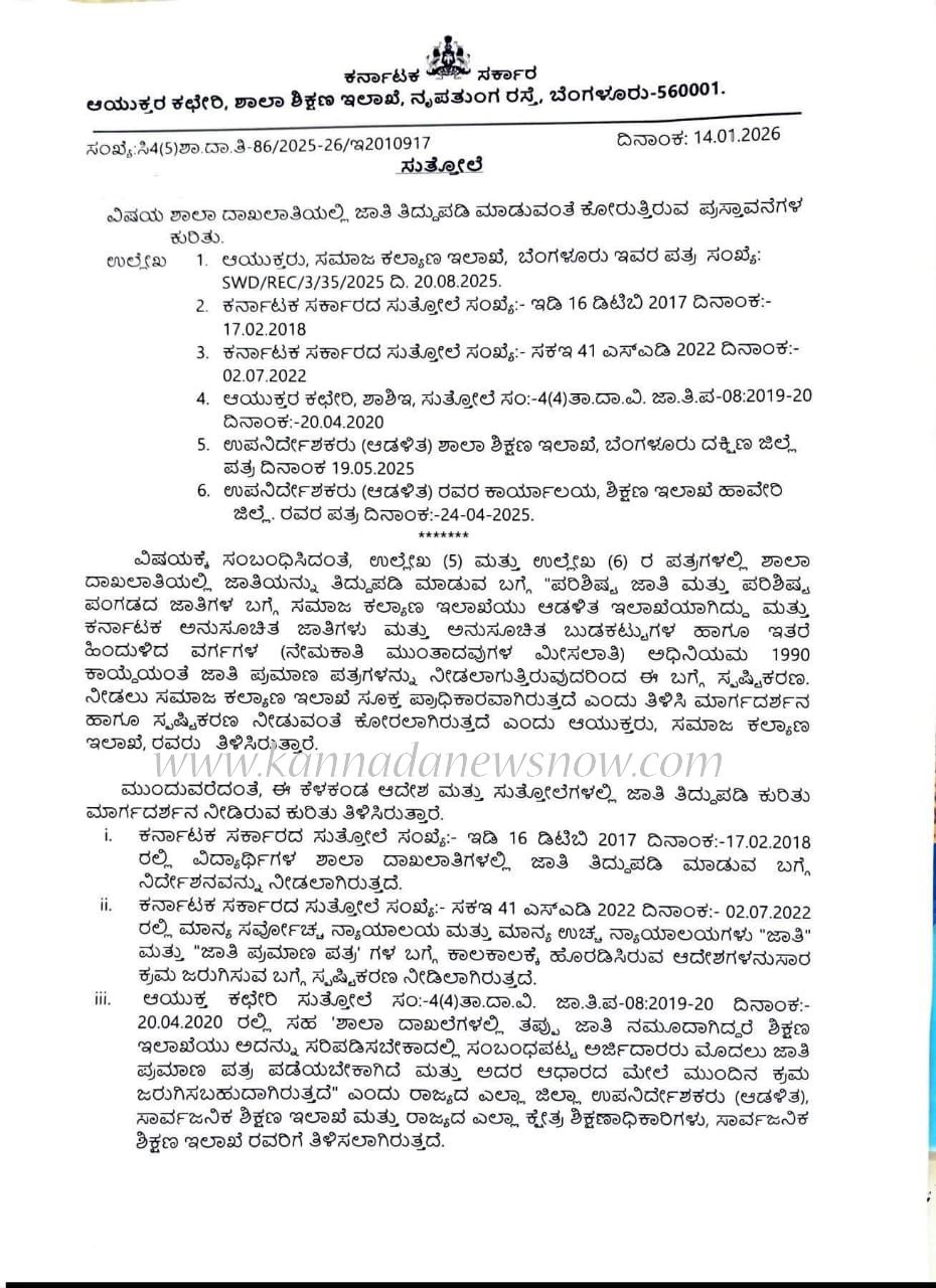 ಶಾಲಾ ದಾಖಲಾತಿಯಲ್ಲಿ ಜಾತಿ ತಿದ್ದುಪಡಿ ಸಂಬಂಧ ಈಗಾಗಲೇ ಈ ಮೇಲಿನ ಸರಕಾರದ ಆದೇಶ/ ಸುತ್ತೋಲೆಗಳನ್ನು ಜಾರಿ ಮಾಡಿದ್ದಾಗ್ಯೂ, ಸಮಾಜ ಕಲ್ಯಾಣ ಇಲಾಖೆ ಹಾಗೂ ಈ ಕಚೇರಿಗೆ ಪದೇ ಪದೇ ಮಾರ್ಗದರ್ಶನ ಕೋರುತ್ತಿರುವುದನ್ನು ಗಂಭೀರವಾಗಿ ಪರಿಗಣಿಸಿದೆ.