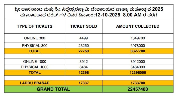 ಹಾಸನಾಂಬೆ ದೇವಿ ಹಾಗೂ ಶ್ರೀ ಸಿದ್ದೇಶ್ವರಸ್ವಾಮಿ ಜಾತ್ರಾ ಮಹೋತ್ಸವವು ಗುರುವಾರದಿಂದ ಆರಂಭಗೊಂಡಿದೆ. ಶುಕ್ರವಾರಕ್ಕೆ ಎರಡನೇ ದಿನವಾಗಿದ್ದು, ಭಾನುವಾರ ಬೆಳಗ್ಗೆ 8 ಗಂಟೆಯವರೆಗೆ 300 ರೂಪಾಯಿಯ ವಿಶೇಷ ದರ್ಶನದ ಆನ್ ಲೈನ್ ಟಿಕೆಟ್ 4,499 ಸೇಲ್ ಆಗಿದ್ದರೇ, ದೇವಸ್ಥಾನದ ಬಳಿಯಲ್ಲೇ 23,260 ಸೇಲ್ ಆಗಿದೆ. ಒಟ್ಟು 300 ರೂಪಾಯಿಗಳ 27,759 ಟಿಕೆಟ್ ಮಾರಾಟವಾಗಿದೆ.