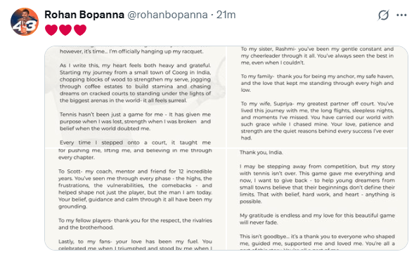 ಇನ್ಸ್ಟಾಗ್ರಾಮ್ನಲ್ಲಿ ಹಂಚಿಕೊಂಡ ಭಾವನಾತ್ಮಕ ಟಿಪ್ಪಣಿಯಲ್ಲಿ, ಬೋಪಣ್ಣ ಹೀಗೆ ಬರೆದಿದ್ದಾರೆ: “ನಿಮ್ಮ ಜೀವನಕ್ಕೆ ಅರ್ಥವನ್ನು ನೀಡಿದ ಯಾವುದನ್ನಾದರೂ ನೀವು ಹೇಗೆ ವಿದಾಯ ಹೇಳುತ್ತೀರಿ? ಪ್ರವಾಸದಲ್ಲಿ 20 ಮರೆಯಲಾಗದ ವರ್ಷಗಳ ನಂತರ, ನಾನು ಅಧಿಕೃತವಾಗಿ ನನ್ನ ರಾಕೆಟ್ ಅನ್ನು ನೇತುಹಾಕುವ ಸಮಯ ಬಂದಿದೆ. ನನ್ನ ಸರ್ವ್ ಅನ್ನು ಬಲಪಡಿಸಲು ಕೂರ್ಗ್ನಲ್ಲಿ ಮರ ಕತ್ತರಿಸುವುದರಿಂದ ಹಿಡಿದು, ವಿಶ್ವದ ಅತಿದೊಡ್ಡ ಕ್ರೀಡಾಂಗಣಗಳ ದೀಪಗಳ ಕೆಳಗೆ ನಿಲ್ಲುವವರೆಗೆ – ಇದು ಅವಾಸ್ತವಿಕವೆನಿಸುತ್ತದೆ. ಭಾರತವನ್ನು ಪ್ರತಿನಿಧಿಸುವುದು ನನ್ನ ಜೀವನದ ಶ್ರೇಷ್ಠ ಗೌರವವಾಗಿದೆ.