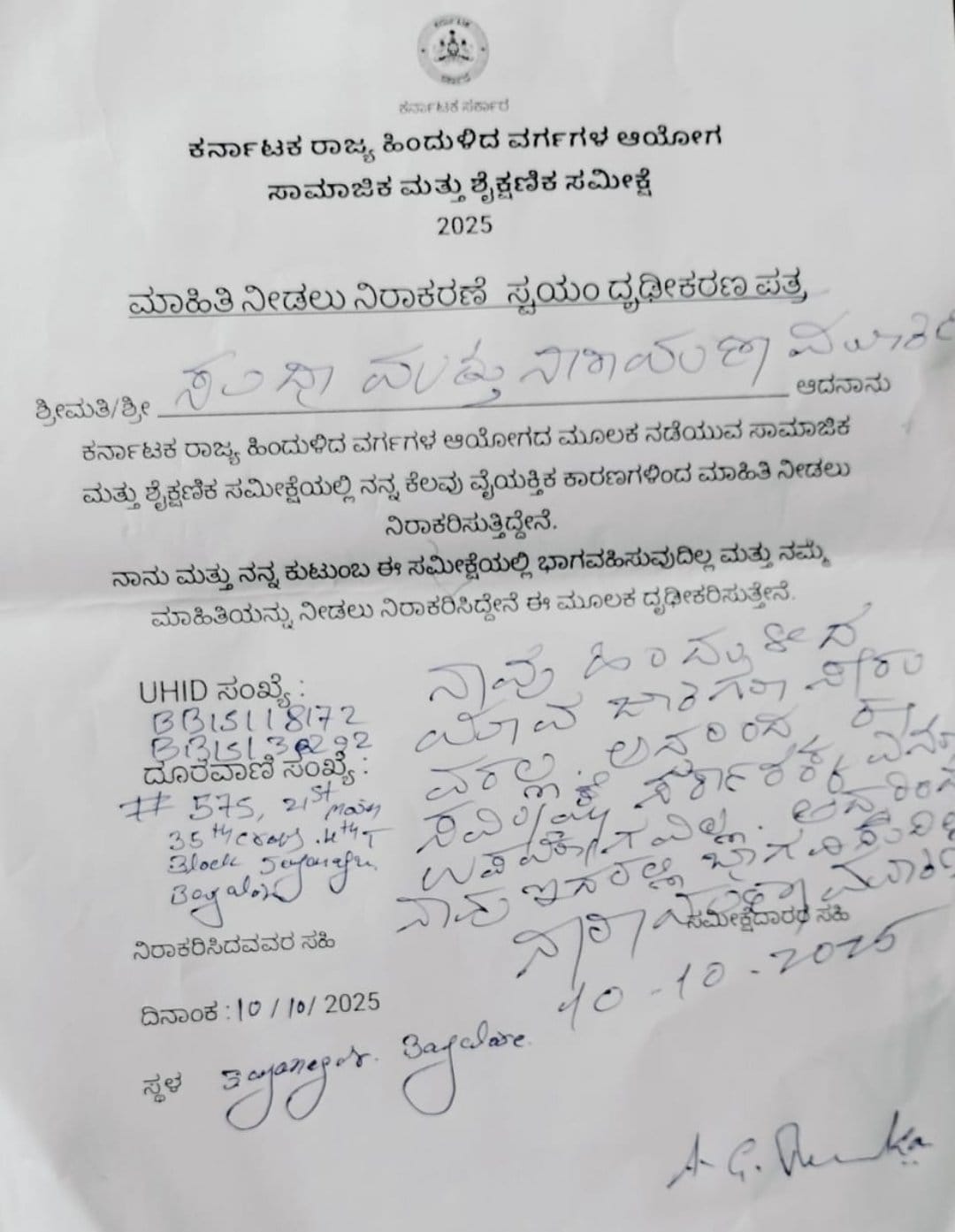 ಹೌದು. ಇಂಡಿಯಾ ಟುಡೇ ವರದಿಯ ಪ್ರಕಾರ, ಸುಧಾ ಮೂರ್ತಿ ಅವರು ಸಮೀಕ್ಷೆಯ ನಮೂನೆಯಲ್ಲಿ ಹೇಳಿಕೆಯನ್ನು ಬರೆದು ಸಹಿ ಮಾಡಿದ್ದಾರೆ ಎಂದು ಹೇಳಲಾಗಿದ್ದು, ಸಮೀಕ್ಷೆಯು ತಮ್ಮ ಪ್ರಕರಣದಲ್ಲಿ ಸರ್ಕಾರಕ್ಕೆ ಯಾವುದೇ ಪ್ರಸ್ತುತತೆ ಅಥವಾ ಉಪಯೋಗವನ್ನು ಹೊಂದಿಲ್ಲ ಎಂದು ಘೋಷಿಸಿದ್ದಾರೆ. ದಂಪತಿಗಳು ಪ್ರಕ್ರಿಯೆಯಿಂದ ಹೊರಗುಳಿಯುವ ಸ್ವಯಂ ಘೋಷಣೆ ಪತ್ರವನ್ನು ಸಹ ಸಲ್ಲಿಸಿದ್ದಾರೆ.
