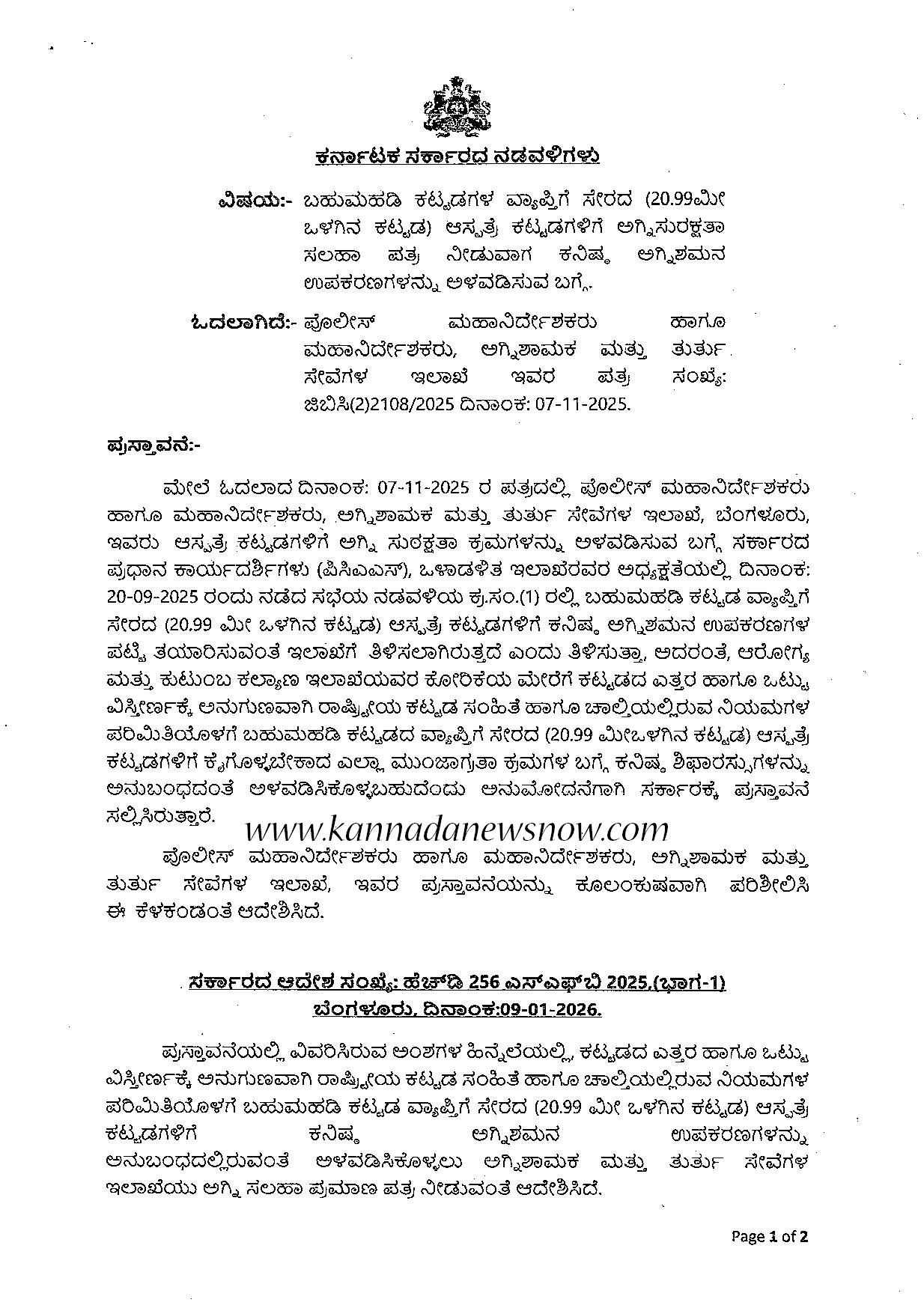 ಪ್ರಸ್ತಾವನೆಯಲ್ಲಿ ವಿವರಿಸಿರುವ ಅಂಶಗಳ ಹಿನ್ನೆಲೆಯಲ್ಲಿ, ಕಟ್ಟಡದ ಎತ್ತರ ಹಾಗೂ ಒಟ್ಟು ವಿಸ್ತೀರ್ಣಕ್ಕೆ ಅನುಗುಣವಾಗಿ ರಾಷ್ಟ್ರೀಯ ಕಟ್ಟಡ ಸಂಹಿತೆ ಹಾಗೂ ಚಾಲ್ತಿಯಲ್ಲಿರುವ ನಿಯಮಗಳ ಪರಿಮಿತಿಯೊಳಗೆ ಬಹುಮಹಡಿ ಕಟ್ಟಡ ವ್ಯಾಪ್ತಿಗೆ ಸೇರದ (20.99 ಮೀ ಒಳಗಿನ ಕಟ್ಟಡ) ಆಸ್ಪತ್ರೆ ಕಟ್ಟಡಗಳಿಗೆ ಕನಿಷ್ಠ ಅಗ್ನಿಶಮನ ಅನುಬಂಧದಲ್ಲಿರುವಂತೆ ಅಳವಡಿಸಿಕೊಳ್ಳಲು ಅಗ್ನಿಶಾಮಕ ಉಪಕರಣಗಳನ್ನು ತುರ್ತು ಸೇವೆಗಳ ಮತ್ತು ಇಲಾಖೆಯು ಅಗ್ನಿ ಸಲಹಾ ಪ್ರಮಾಣ ಪತ್ರ ನೀಡುವಂತೆ ಆದೇಶಿಸಿದ್ದಾರೆ.