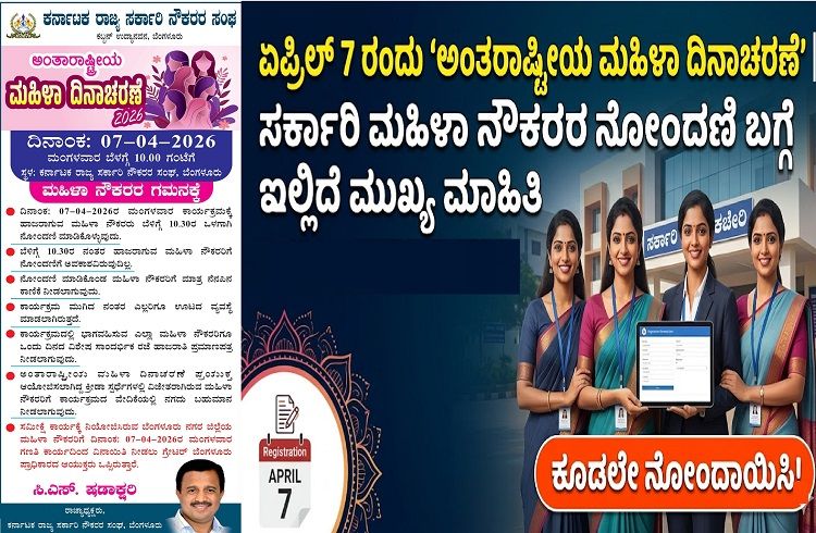 ಬೆಂಗಳೂರು: ಕರ್ನಾಟಕ ರಾಜ್ಯ ಸರ್ಕಾರಿ ನೌಕರರ ಸಂಘದ ವತಿಯಿಂದ 2026ರ ಅಂತರಾಷ್ಟ್ರೀಯ ಮಹಿಳಾ ದಿನಾಚರಣೆಯನ್ನು ಅತ್ಯಂತ ಸಡಗರದಿಂದ ಆಯೋಜಿಸಲಾಗಿದೆ. ನಗರದ ಕಬ್ಬನ್ ಉದ್ಯಾನವನದಲ್ಲಿರುವ ಸಂಘದ ಆವರಣದಲ್ಲಿ ಏಪ್ರಿಲ್ 7, ಮಂಗಳವಾರ ಬೆಳಿಗ್ಗೆ 10:00 ಗಂಟೆಗೆ ಈ ಕಾರ್ಯಕ್ರಮ ನಡೆಯಲಿದೆ.
