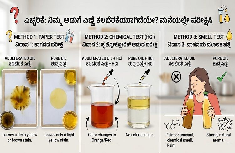 ನಿಮ್ಮ ಮನೆಯಲ್ಲಿರುವ ಎಣ್ಣೆ ಶುದ್ಧವಾಗಿದೆಯೇ ಎಂದು ಪತ್ತೆಹಚ್ಚಲು ಮಾರುಕಟ್ಟೆಗೆ ಹೋಗಬೇಕಿಲ್ಲ; ಈ ಕೆಳಗಿನ ಸರಳ ವಿಧಾನಗಳ ಮೂಲಕ ಮನೆಯಲ್ಲೇ ಪರೀಕ್ಷಿಸಬಹುದು.