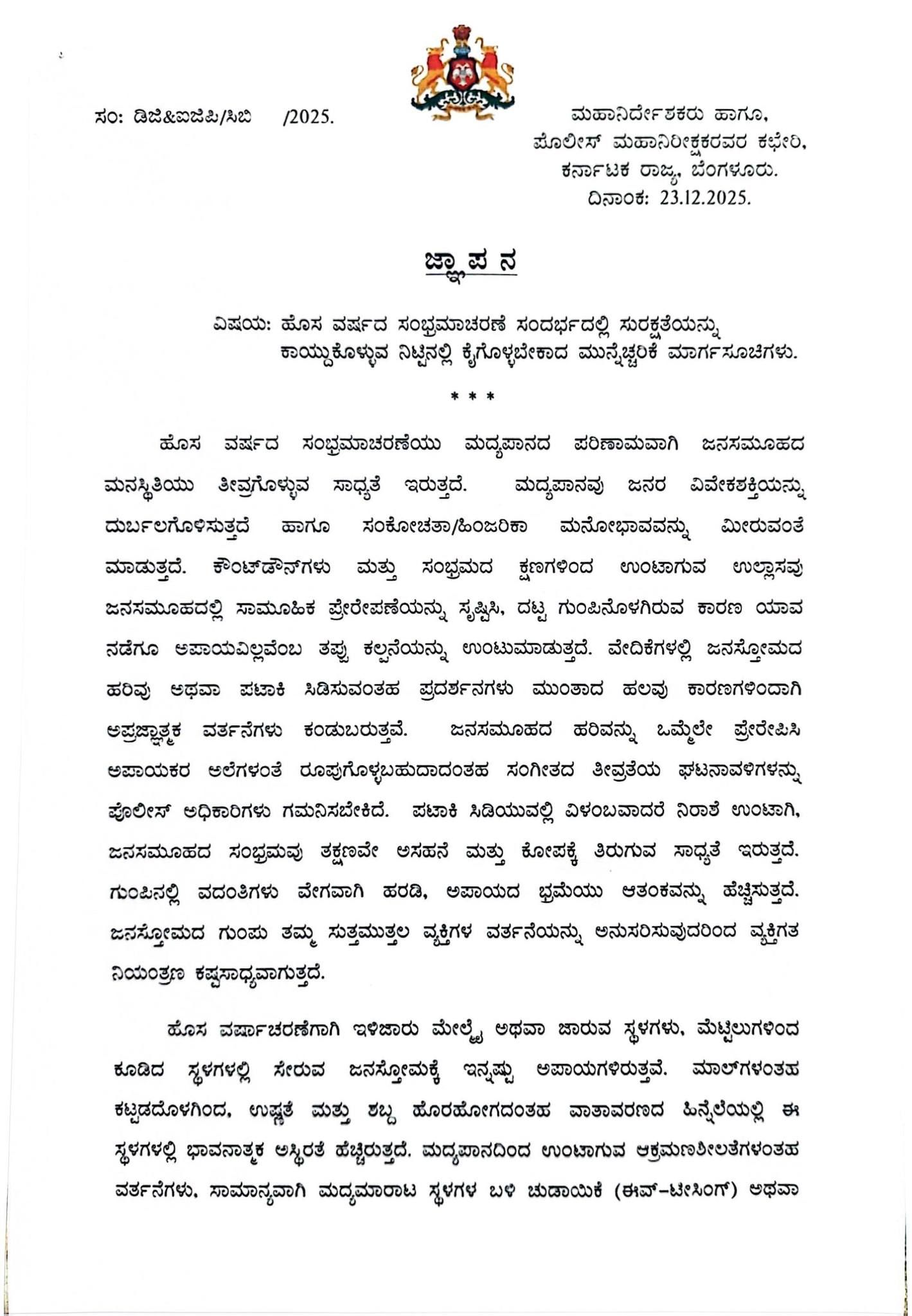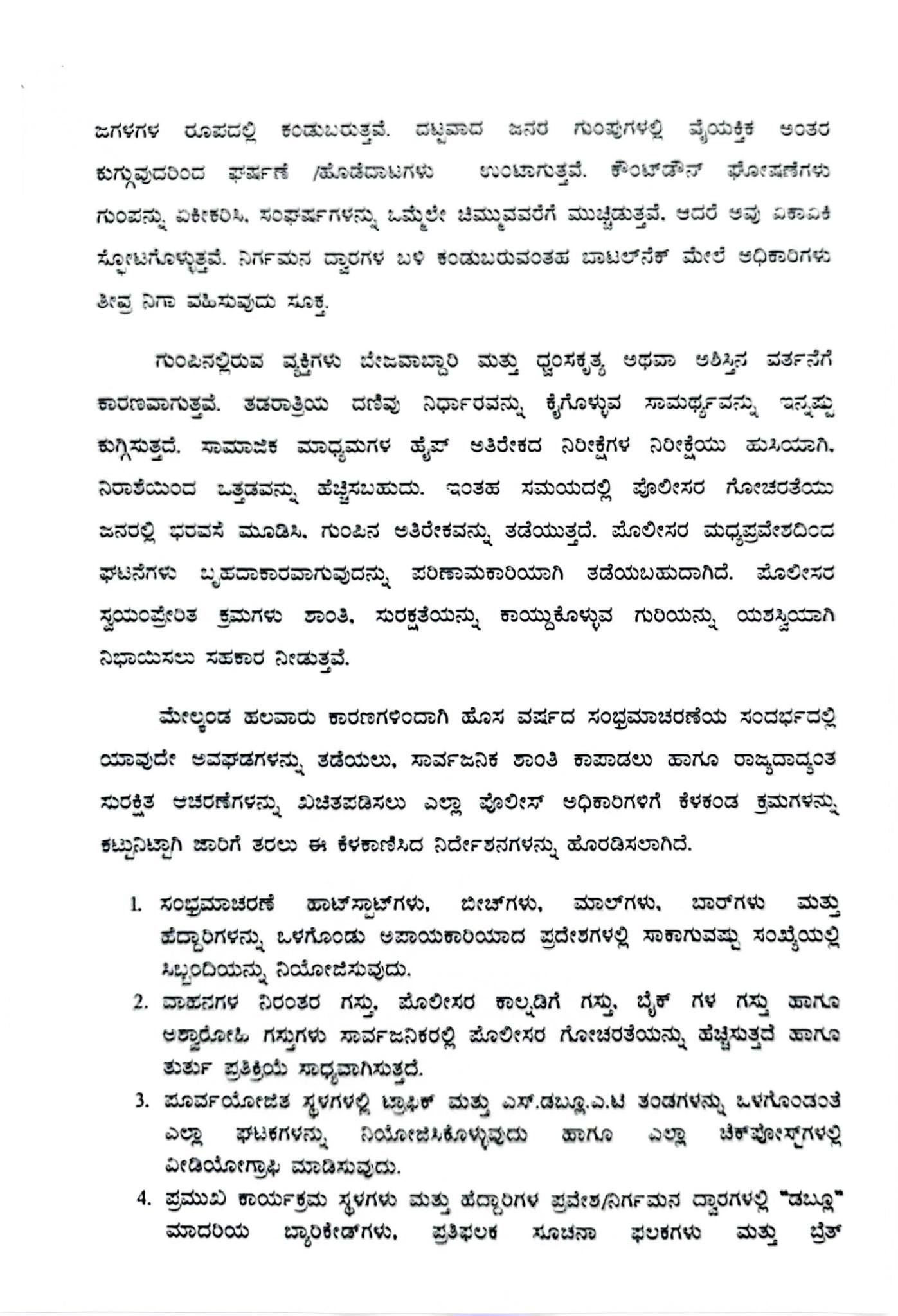 ಮೇಲ್ಕಂಡ ಹಲವಾರು ಕಾರಣಗಳಿಂದಾಗಿ ಹೊಸ ವರ್ಷದ ಸಂಭ್ರಮಾಚರಣೆಯ ಸಂದರ್ಭದಲ್ಲಿ ಯಾವುದೇ ಅವಘಡಗಳನ್ನು ತಡೆಯಲು, ಸಾರ್ವಜನಿಕ ಶಾಂತಿ ಕಾಪಾಡಲು ಹಾಗೂ ರಾಜ್ಯದಾದ್ಯಂತ ಸುರಕ್ಷಿತ ಆಚರಣೆಗಳನ್ನು ಖಚಿತಪಡಿಸಲು ಎಲ್ಲಾ ಪೊಲೀಸ್ ಅಧಿಕಾರಿಗಳಿಗೆ ಕೆಳಕಂಡ ಕ್ರಮಗಳನ್ನು ಕಟ್ಟುನಿಟ್ಟಾಗಿ ಜಾರಿಗೆ ತರಲು ಈ ಕೆಳಕಾಣಿಸಿದ ನಿರ್ದೇಶನಗಳನ್ನು ಹೊರಡಿಸಲಾಗಿದೆ.