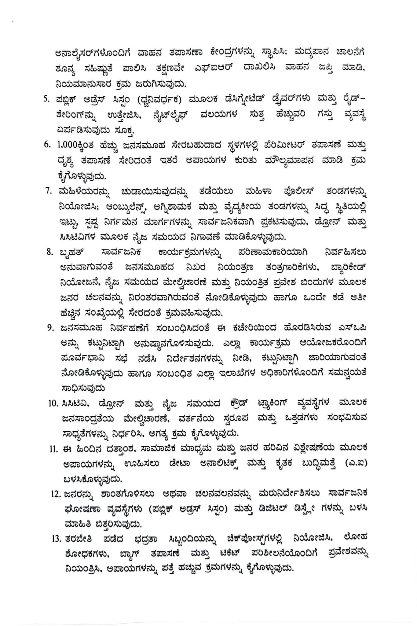 7. ಮಹಿಳೆಯರನ್ನು ಚುಡಾಯಿಸುವುದನ್ನು ತಡೆಯಲು ಮಹಿಳಾ ಪೊಲೀಸ್ ತಂಡಗಳನ್ನು ನಿಯೋಜಿಸಿ; ಆಂಬ್ಯುಲೆನ್ಸ್, ಅಗ್ನಿಶಾಮಕ ಮತ್ತು ವೈದ್ಯಕೀಯ ತಂಡಗಳನ್ನು ಸಿದ್ಧ ಸ್ಥಿತಿಯಲ್ಲಿ ಇಟ್ಟು, ಸ್ಪಷ್ಟ ನಿರ್ಗಮನ ಮಾರ್ಗಗಳನ್ನು ಸಾರ್ವಜನಿಕವಾಗಿ ಪ್ರಕಟಿಸುವುದು, ಡೋನ್ ಮತ್ತು ಸಿಸಿಟಿವಿಗಳ ಮೂಲಕ ನೈಜ ಸಮಯದ ನಿಗಾವಣೆ ಮಾಡಿಕೊಳ್ಳುವುದು.