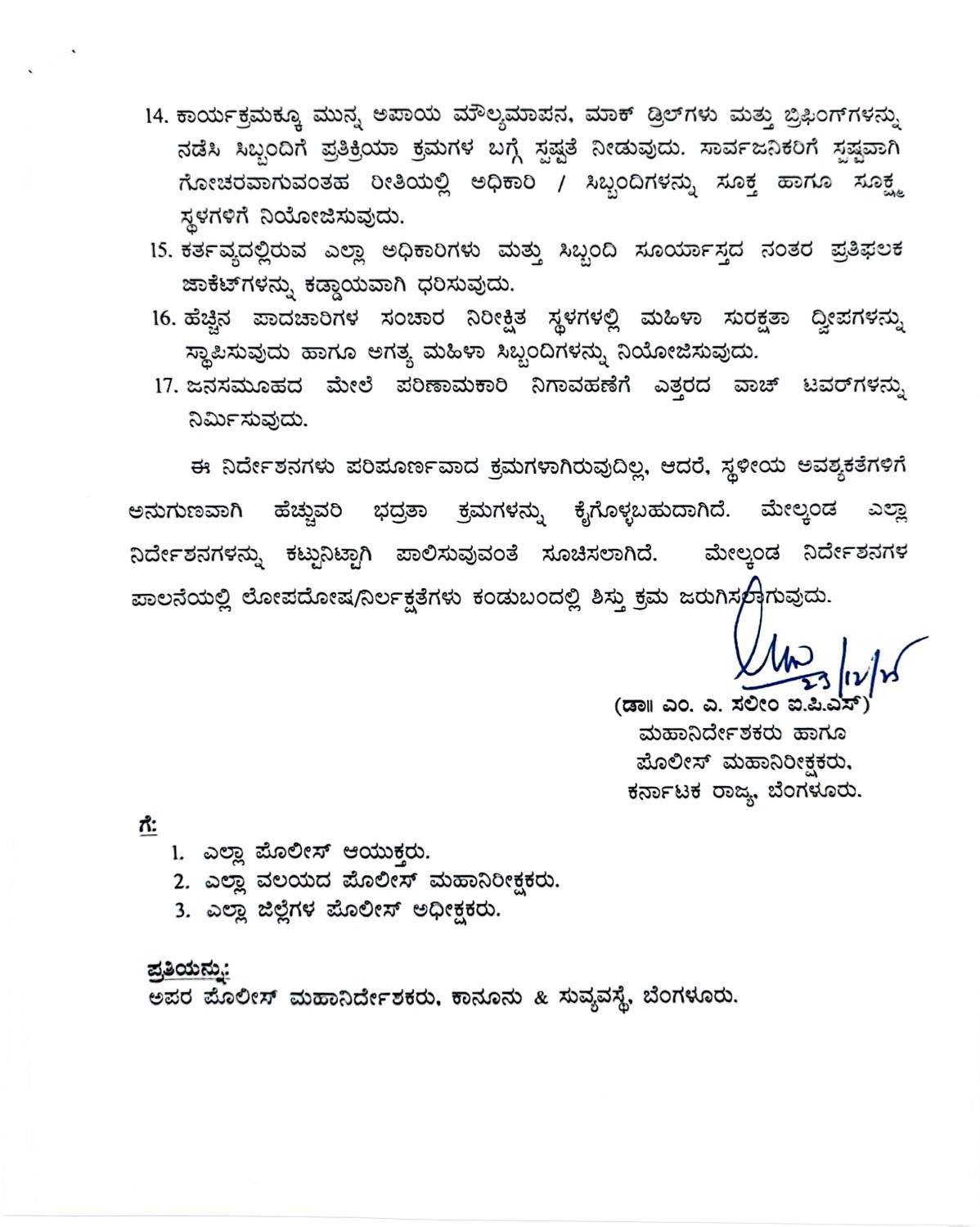 ಈ ನಿರ್ದೇಶನಗಳು ಪರಿಪೂರ್ಣವಾದ ಕ್ರಮಗಳಾಗಿರುವುದಿಲ್ಲ, ಆದರೆ, ಸ್ಥಳೀಯ ಅವಶ್ಯಕತೆಗಳಿಗೆ ಅನುಗುಣವಾಗಿ ಹೆಚ್ಚುವರಿ ಭದ್ರತಾ ಕ್ರಮಗಳನ್ನು ಕೈಗೊಳ್ಳಬಹುದಾಗಿದೆ. ಮೇಲ್ಕಂಡ ಎಲ್ಲಾ ನಿರ್ದೇಶನಗಳನ್ನು ಕಟ್ಟುನಿಟ್ಟಾಗಿ ಪಾಲಿಸುವುವಂತೆ ಸೂಚಿಸಲಾಗಿದೆ. ಮೇಲ್ಕಂಡ ನಿರ್ದೇಶನಗಳ ಪಾಲನೆಯಲ್ಲಿ ಲೋಪದೋಷನಿರ್ಲಕ್ಷತೆಗಳು ಕಂಡುಬಂದಲ್ಲಿ ಶಿಸ್ತು ಕ್ರಮ ಜರುಗಿಸಲಾಗುವುದು.