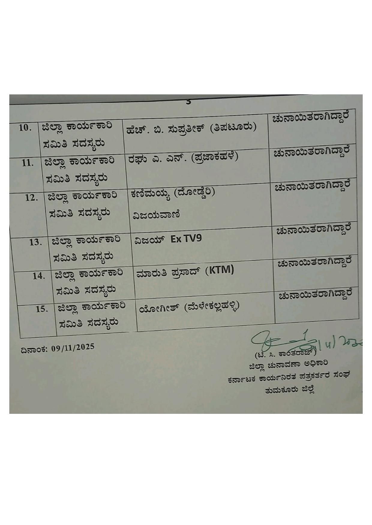 ಈ ಬಗ್ಗೆ ಜಿಲ್ಲಾ ಚುನಾವಣಾಧಿಕಾರಿ ಟಿ.ಸಿ ಕಾಂತರಾಜ್ ಮಾಹಿತಿ ನೀಡಿದ್ದು, ಕರ್ನಾಟಕ ಕಾರ್ಯನಿರತ ಪತ್ರಕರ್ತರ ಸಂಘದ ತುಮಕೂರು ಜಿಲ್ಲಾ ಘಟಕಕ್ಕೆ ಚುನಾವಣೆ ನಡೆಯಿತು. ಮತಏಣಿಕೆಯ ನಂತ್ರ ಆಯ್ಕೆಯಾದ ಪದಾಧಿಕಾರಿಗಳು, ರಾಜ್ಯ ಪರಿಷತ್ ಸದಸ್ಯರು ಹಾಗೂ ಜಿಲ್ಲಾ ಕಾರ್ಯಕಾರಿಣಿ ಸದಸ್ಯರ ವಿವರ ಈ ಕೆಳಗಿನಂತಿದೆ ಎಂಬುದಾಗಿ ತಿಳಿಸಿದ್ದಾರೆ.