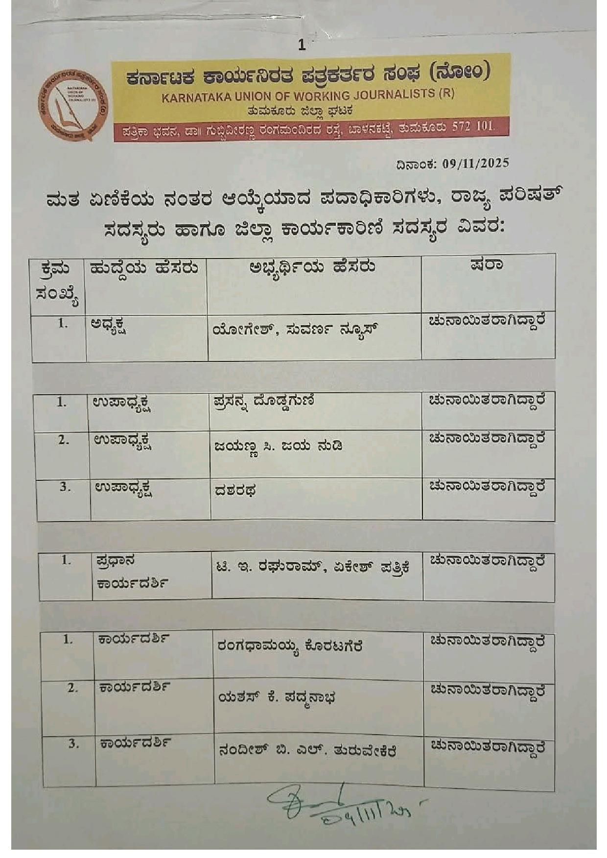 ತುಮಕೂರು ಜಿಲ್ಲಾ ಘಟಕದ ಕರ್ನಾಟಕ ಕಾರ್ಯನಿರತ ಪತ್ರಕರ್ತರ ಸಂಘದ ಅಧ್ಯಕ್ಷರಾಗಿ ಸುವರ್ಣ ನ್ಯೂಸ್ ಯೋಗೇಶ್ ಅವರು ಚುನಾಯಿತರಾಗಿದ್ದರೇ, ಉಪಾಧ್ಯಕ್ಷರಾಗಿ ಜಯ್ಯಣ್ಣ ಸಿ ಜಯನುಡಿ, ದಶರಥ ಚುನಾಯಿತರಾಗಿದ್ದಾರೆ. ಪ್ರಧಾನ ಕಾರ್ಯದರ್ಶಿಯಾಗಿ ಏಕೇಶ್ ಪತ್ರಿಕೆಯ ಟಿಇ ರಘುರಾಮ್ ಆಯ್ಕೆಯಾಗಿದ್ದಾರೆ.