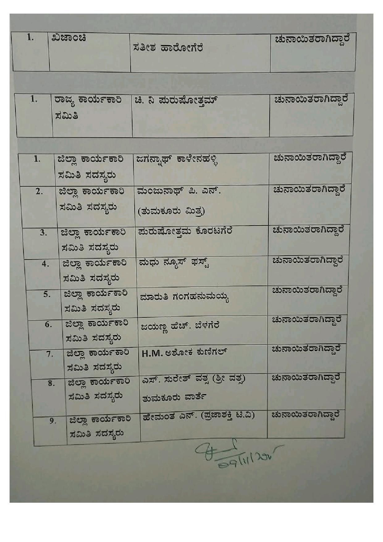 ಖಜಾಂಚಿಯಾಗಿ ಸತೀಶ್ ಹಾರೋಗೆರೆ, ರಾಜ್ಯ ಕಾರ್ಯಕಾರಿ ಸಮಿತಿಗೆ ಚಿ.ನಿ ಪುರುಷೋತ್ತಮ್, ಜಿಲ್ಲಾ ಕಾರ್ಯಕಾರಿ ಸಮಿತಿ ಸದಸ್ಯರಾಗಿ ಜಿಲ್ಲಾ ಚುನಾವಣಾಧಿಕಾರಿ ಟಿ.ಸಿ ಕಾಂತರಾಜ್ ಘೋಷಿಸಿದ್ದಾರೆ.