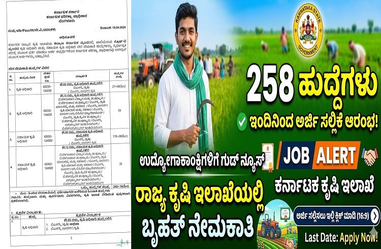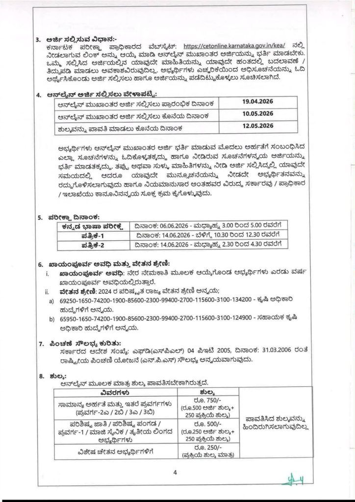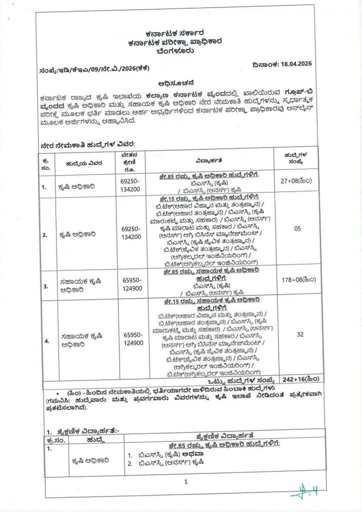 ಬೆಂಗಳೂರು: ಕರ್ನಾಟಕ ಸರ್ಕಾರದ ಕೃಷಿ ಇಲಾಖೆಯಲ್ಲಿ ಖಾಲಿ ಇರುವ ಕಲ್ಯಾಣ ಕರ್ನಾಟಕ ವೃಂದದ ಗ್ರೂಪ್-ಬಿ ವೃಂದದ ಹುದ್ದೆಗಳ ನೇರ ನೇಮಕಾತಿಗೆ ಕರ್ನಾಟಕ ಪರೀಕ್ಷಾ ಪ್ರಾಧಿಕಾರವು (KEA) ಅಧಿಕೃತ ಅಧಿಸೂಚನೆ ಹೊರಡಿಸಿದೆ. ಅರ್ಹ ಅಭ್ಯರ್ಥಿಗಳು ಆನ್ಲೈನ್ ಮೂಲಕ ಅರ್ಜಿ ಸಲ್ಲಿಸಲು ಅವಕಾಶ ಕಲ್ಪಿಸಲಾಗಿದೆ.