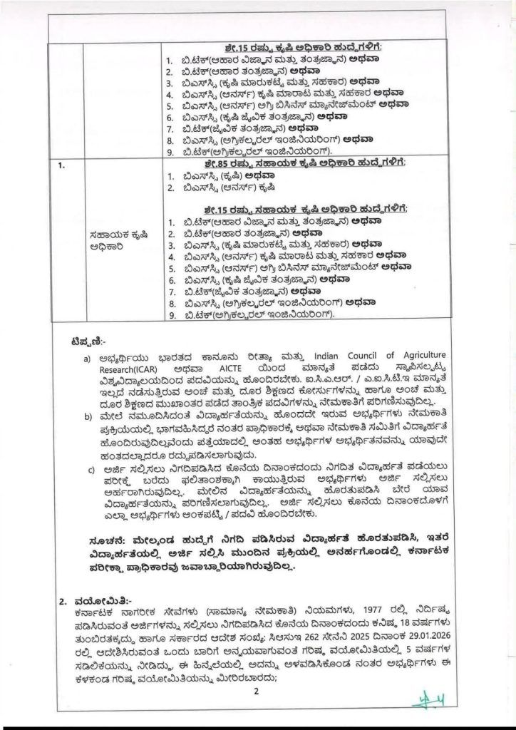 ಅಭ್ಯರ್ಥಿಗಳು ಮಾನ್ಯತೆ ಪಡೆದ ವಿಶ್ವವಿದ್ಯಾಲಯದಿಂದ ಬಿ.ಎಸ್ಸಿ (ಕೃಷಿ), ಬಿ.ಎಸ್ಸಿ (ಅನರ್ಸ್ ಕೃಷಿ) ಅಥವಾ ಅಧಿಸೂಚನೆಯಲ್ಲಿ ತಿಳಿಸಿರುವಂತೆ ಕೃಷಿ ಸಂಬಂಧಿತ ಇಂಜಿನಿಯರಿಂಗ್/ತಂತ್ರಜ್ಞಾನ ಪದವಿಗಳನ್ನು ಹೊಂದಿರಬೇಕು.