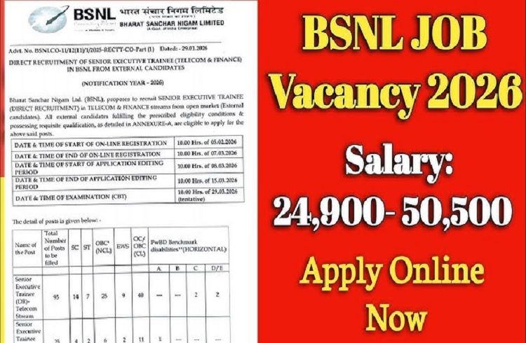 ನವದೆಹಲಿ : ಕೇಂದ್ರ ಸರ್ಕಾರ ನಡೆಸುವ ಟೆಲಿಕಾಂ ಕಂಪನಿಯಾದ ಭಾರತ್ ಸಂಚಾರ್ ನಿಗಮ್ ಲಿಮಿಟೆಡ್ (BSNL), 2026 ರ ಸೀನಿಯರ್ ಎಕ್ಸಿಕ್ಯುಟಿವ್ ಟ್ರೈನಿ (SET) ಹುದ್ದೆಗಳ ನೇಮಕಾತಿಗೆ ಅರ್ಜಿ ಆಹ್ವಾನಿಸಿದೆ