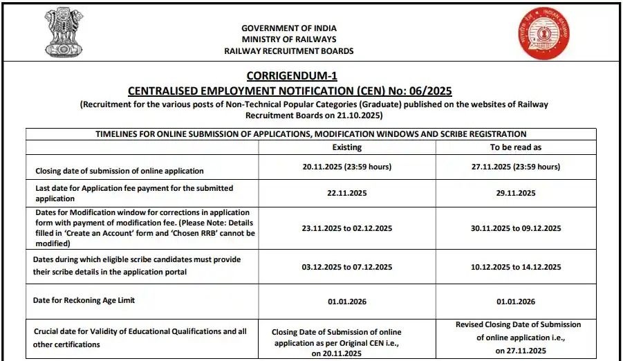 ನವದೆಹಲಿ : ರೈಲ್ವೆ ನೇಮಕಾತಿ ಮಂಡಳಿ (RRB) NTPC ಪದವಿ ಮತ್ತು ಪದವಿಪೂರ್ವ ಹುದ್ದೆಗಳ ನೇಮಕಾತಿಗೆ ಅರ್ಜಿ ಸಲ್ಲಿಸುವ ಪ್ರಕ್ರಿಯೆ ಡಿಸೆಂಬರ್ 4ರವರೆಗೆ ವಿಸ್ತರಣೆ ಮಾಡಿದೆ. ಆಸಕ್ತ ಮತ್ತು ಅರ್ಹ ಅಭ್ಯರ್ಥಿಗಳು ಅರ್ಜಿ ಸಲ್ಲಿಸಲು ಅಧಿಕೃತ ವೆಬ್ಸೈಟ್ rrbapply.gov.in ಗೆ ಭೇಟಿ ನೀಡಬೇಕು.