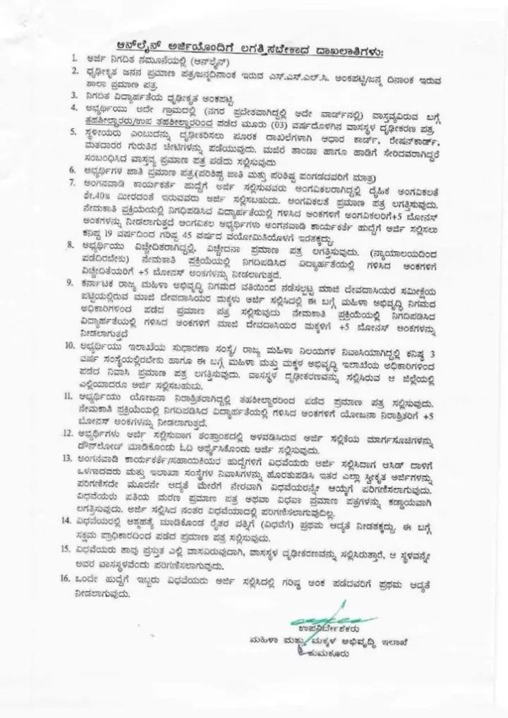 1. ಅಂಗನವಾಡಿ ಕಾರ್ಯಕರ್ತೆ ಹಾಗೂ ಸಹಾಯಕಿ ಹುದ್ದೆಗಳಿಗೆ ಆನ್ಲೈನ್(Online)ನಲ್ಲಿ ಸಲ್ಲಿಸಿದ ಅರ್ಜಿಗಳನ್ನು ಮಾತ್ರ ಪರಿಗಣಿಸಲಾಗುವುದು.