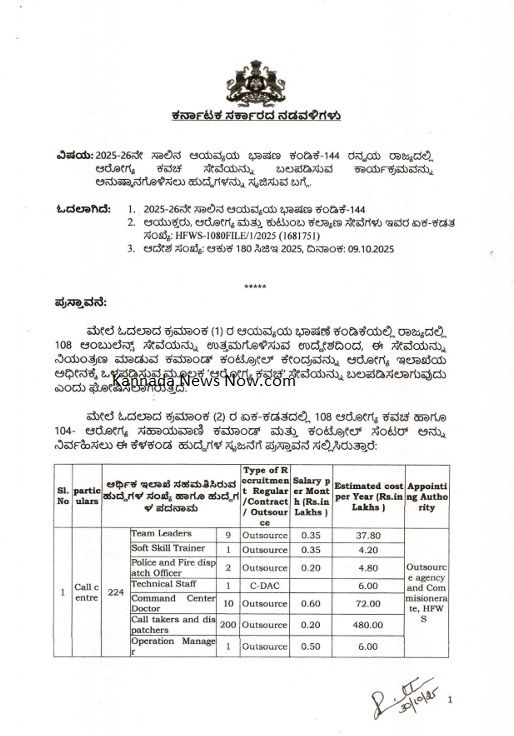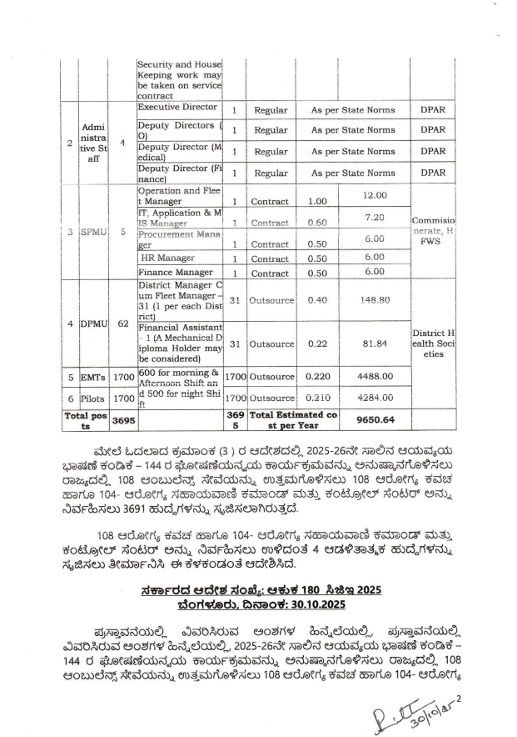 ಮೇಲೆ ಓದಲಾದ ಕ್ರಮಾಂಕ (3) ರ ಆದೇಶದಲ್ಲಿ 2025-26ನೇ ಸಾಲಿನ ಆಯವ್ಯಯ ಭಾಷಣೆ ಕಂಡಿಕೆ – 144 ರ ಘೋಷಣೆಯನ್ವಯ ಕಾರ್ಯಕ್ರಮವನ್ನು ಅನುಷ್ಠಾನಗೊಳಿಸಲು ರಾಜ್ಯದಲ್ಲಿ 108 ಆಂಬುಲೆನ್ಸ್ ಸೇವೆಯನ್ನು ಉತ್ತಮಗೊಳಿಸಲು 108 ಆರೋಗ್ಯ ಕವಚ ಹಾಗೂ 104- ಆರೋಗ್ಯ ಸಹಾಯವಾಣಿ ಕಮಾಂಡ್ ಮತ್ತು ಕಂಟ್ರೋಲ್ ಸೆಂಟರ್ ಅನ್ನು ನಿರ್ವಹಿಸಲು 3691 ಹುದ್ದೆಗಳನ್ನು ಸೃಜಿಸಲಾಗಿರುತ್ತದೆ.