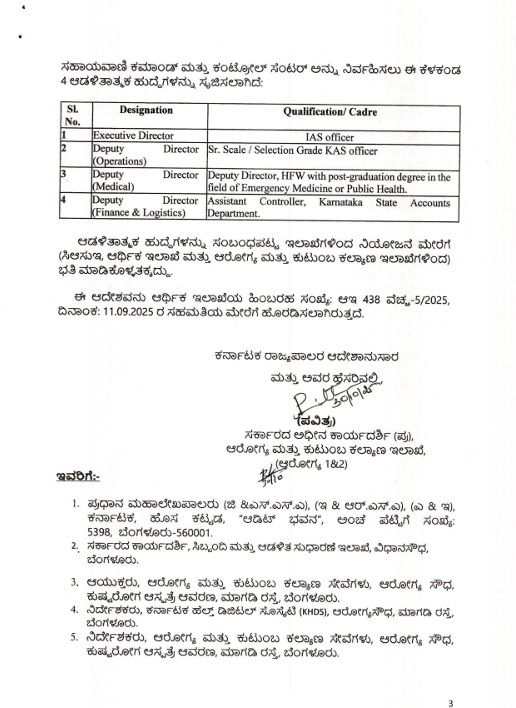108 ಆರೋಗ್ಯ ಕವಚ ಹಾಗೂ 104- ಆರೋಗ್ಯ ಸಹಾಯವಾಣಿ ಕಮಾಂಡ್ ಮತ್ತು ಕಂಟ್ರೋಲ್ ಸೆಂಟರ್ ಅನ್ನು ನಿರ್ವಹಿಸಲು ಉಳಿದಂತೆ 4 ಆಡಳಿತಾತ್ಮಕ ಹುದ್ದೆಗಳನ್ನು ಸೃಜಿಸಲು ತೀರ್ಮಾನಿಸಿ ಈ ಕೆಳಕಂಡಂತೆ ಆದೇಶಿಸಿದೆ.
