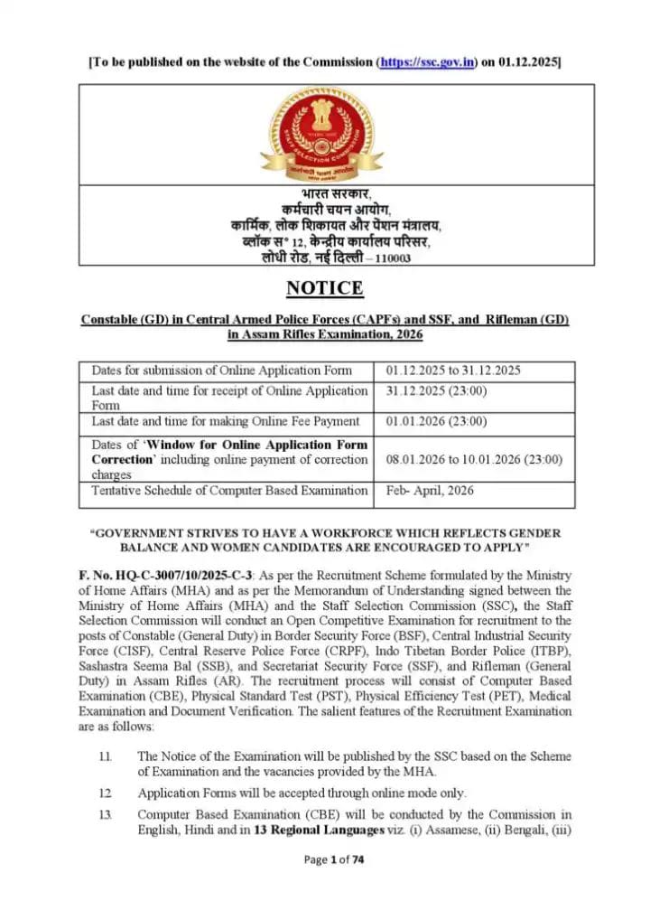 ನವದೆಹಲಿ : ಉದ್ಯೋಗಾಕಾಂಕ್ಷಿಗಳಿಗೆ ಸ್ಟಾಫ್ ಸೆಲೆಕ್ಷನ್ ಕಮಿಷನ್ (SSC) ಸಿಹಿಸುದ್ದಿ ನೀಡಿದ್ದು, 2026 ರ ನೇಮಕಾತಿ ಚಕ್ರಕ್ಕಾಗಿ ಅಸ್ಸಾಂ ರೈಫಲ್ಸ್ ನಲ್ಲಿ ಕೇಂದ್ರ ಸಶಸ್ತ್ರ ಪೊಲೀಸ್ ಪಡೆ (CAPFs), ಸೆಕ್ರೆಟರಿಯೇಟ್ ಸೆಕ್ಯುರಿಟಿ ಫೋರ್ಸ್ (SSF) ಮತ್ತು ರೈಫಲ್ಮನ್ (GD) ಹುದ್ದೆಗಳಲ್ಲಿ 25,487 ಜನರಲ್ ಡ್ಯೂಟಿ (GD) ಕಾನ್ಸ್ಟೇಬಲ್ ಹುದ್ದೆಗಳಿಗೆ ಅರ್ಜಿ ಆಹ್ವಾನಿಸಿದ್ದು, ಅರ್ಜಿ ಸಲ್ಲಿಸಲು ಡಿಸೆಂಬರ್ 31 ಕೊನೆಯ ದಿನವಾಗಿದೆ.