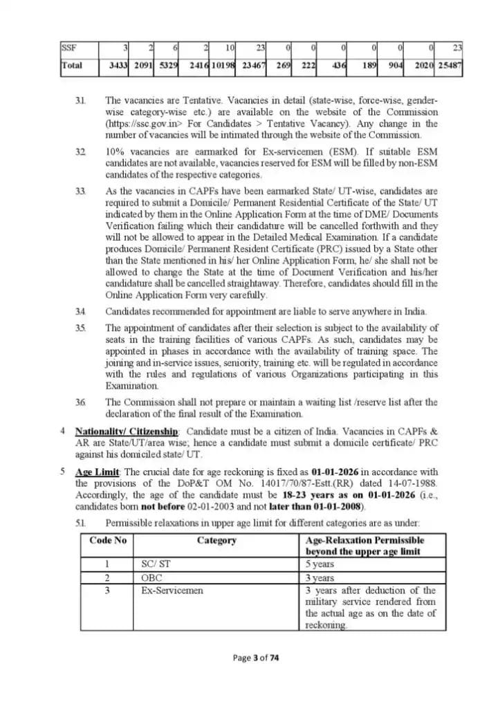 SSC ಕಾನ್ಸ್ಟೇಬಲ್ ನೇಮಕಾತಿ 2026: ಅರ್ಹತಾ ಮಾನದಂಡ: ಅರ್ಹತೆ ಪಡೆಯಲು, ಅಭ್ಯರ್ಥಿಗಳು 18 ರಿಂದ 23 ವರ್ಷ ವಯಸ್ಸಿನವರಾಗಿರಬೇಕು. SC ಮತ್ತು ST ಅಭ್ಯರ್ಥಿಗಳಿಗೆ ಐದು ವರ್ಷಗಳವರೆಗೆ ವಯೋಮಿತಿ ಸಡಿಲಿಕೆ ಲಭ್ಯವಿದೆ, ಆದರೆ OBC ಮತ್ತು ಮಾಜಿ ಸೈನಿಕರಿಗೆ ಮೂರು ವರ್ಷಗಳವರೆಗೆ ವಯೋಮಿತಿ ಸಡಿಲಿಕೆಗೆ ಅರ್ಹವಾಗಿದೆ. ಭಾರತೀಯ ಒಕ್ಕೂಟದ ನಿಯಮಿತ ಸೈನ್ಯ, ನೌಕಾಪಡೆ ಅಥವಾ ವಾಯುಪಡೆಯಲ್ಲಿ ಯೋಧ ಅಥವಾ ಯೋಧೇತರವಾಗಿ ಯಾವುದೇ ಶ್ರೇಣಿಯಲ್ಲಿ ಸೇವೆ ಸಲ್ಲಿಸಿದ ವ್ಯಕ್ತಿಯನ್ನು ಮಾಜಿ ಸೈನಿಕ ಎಂದು ವ್ಯಾಖ್ಯಾನಿಸಲಾಗಿದೆ, ಕೆಲವು ಷರತ್ತುಗಳಿಗೆ ಒಳಪಟ್ಟಿರುತ್ತದೆ.