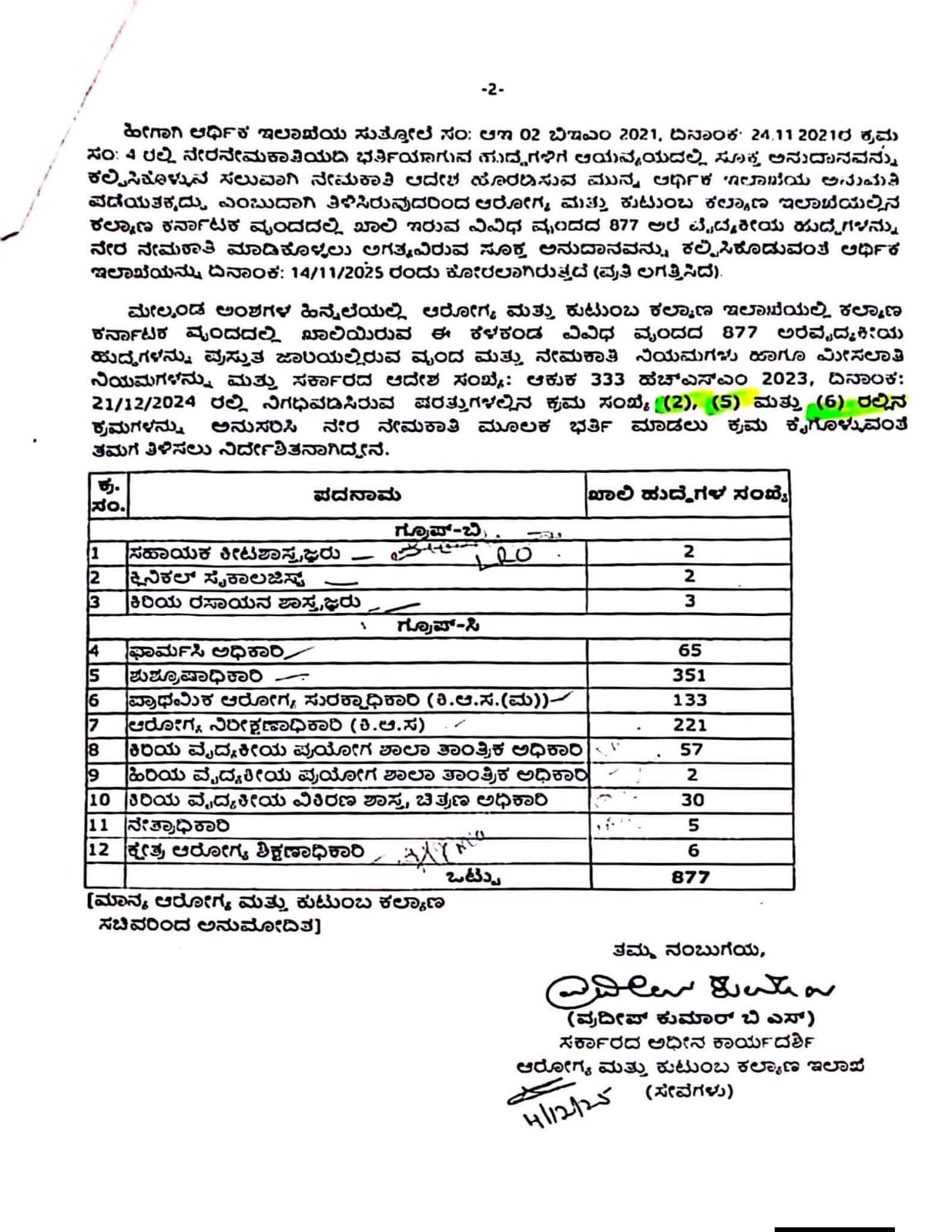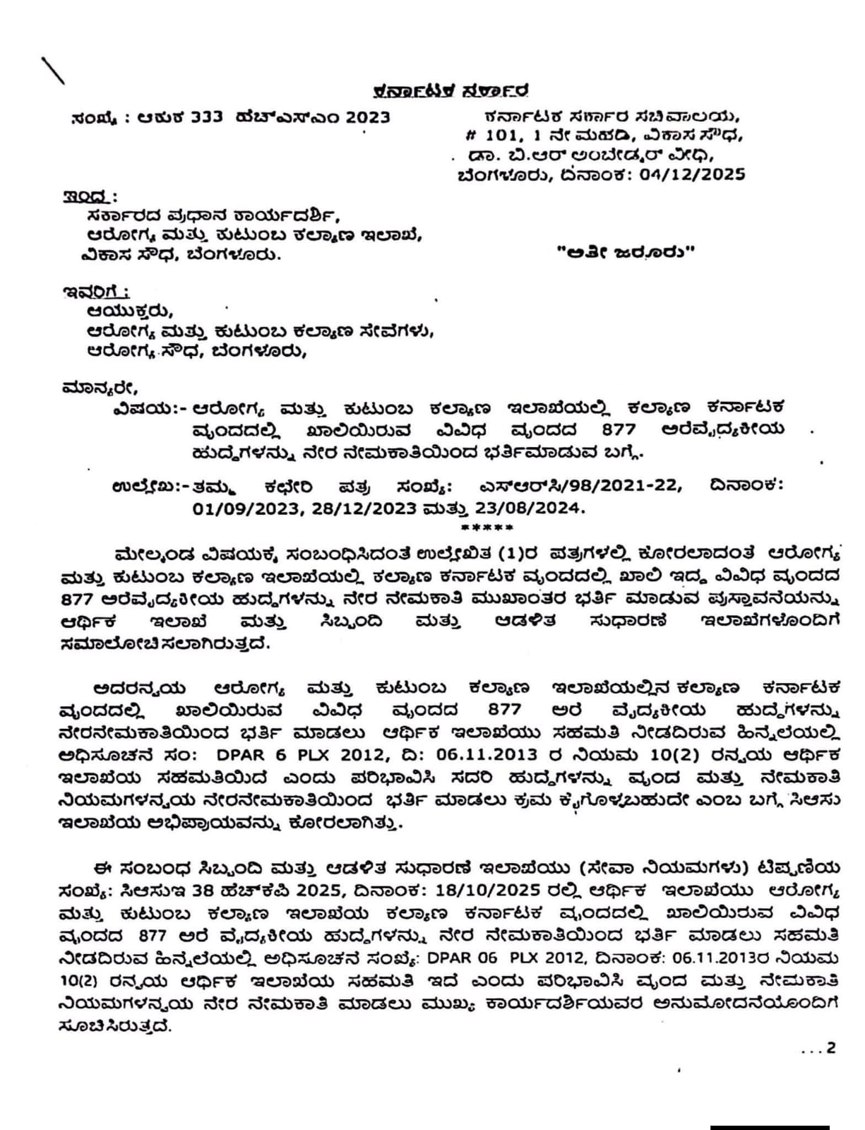 ಈ ಸಂಬಂಧ ಸಿಬ್ಬಂದಿ ಮತ್ತು ಆಡಳಿತ ಸುಧಾರಣೆ ಇಲಾಖೆಯು (ಸೇವಾ ನಿಯಮಗಳು) ಟಿಪ್ಪಣಿಯ ಸಂಖ್ಯೆ: ಸಿಆಸುಇ 38 ಹೆಚ್ಪಿ 2025, ದಿನಾಂಕ: 18/10/2025 ರಲ್ಲಿ ಆರ್ಥಿಕ ಇಲಾಖೆಯು ಆರೋಗ್ಯ ಮತ್ತು ಕುಟುಂಬ ಕಲ್ಯಾಣ ಇಲಾಖೆಯ ಕಲ್ಯಾಣ ಕರ್ನಾಟಕ ವೃಂದದಲ್ಲಿ ಖಾಲಿಯಿರುವ ವಿವಿಧ ವೃಂದದ 877 ಅರೆ ವೈದ್ಯಕೀಯ ಹುದ್ದೆಗಳನ್ನು ನೇರ ನೇಮಕಾತಿಯಿಂದ ಭರ್ತಿ ಮಾಡಲು ಸಹಮತಿ ನೀಡದಿರುವ ಹಿನ್ನೆಲೆಯಲ್ಲಿ ಅಧಿಸೂಚನೆ ಸಂಖ್ಯೆ: DPAR 06 PLX 2012, ದಿನಾಂಕ: 06.11.2013ರ ನಿಯಮ 10(2) ರನ್ವಯ ಆರ್ಥಿಕ ಇಲಾಖೆಯ ಸಹಮತಿ ಇದೆ ಎಂದು ಪರಿಭಾವಿಸಿ ವೃಂದ ಮತ್ತು ನೇಮಕಾತಿ ನಿಯಮಗಳನ್ವಯ ನೇರ ನೇಮಕಾತಿ ಮಾಡಲು ಮುಖ್ಯ ಕಾರ್ಯದರ್ಶಿಯವರ ಅನುಮೋದನೆಯೊಂದಿಗೆ ಸೂಚಿಸಿರುತ್ತದೆ.