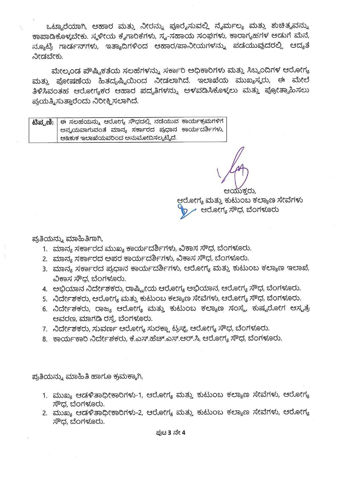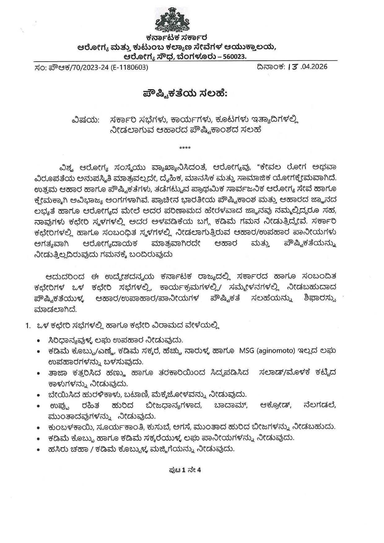 ಬೆಂಗಳೂರು: ಸರ್ಕಾರಿ ಕಚೇರಿಗಳಲ್ಲಿ ನಡೆಯುವ ಸಭೆಗಳು, ಕಾರ್ಯಕ್ರಮಗಳು ಮತ್ತು ಪ್ರದರ್ಶನಗಳಲ್ಲಿ ಇನ್ನು ಮುಂದೆ ಆರೋಗ್ಯಕರ ಆಹಾರ ಪದ್ಧತಿಯನ್ನು ಕಡ್ಡಾಯಗೊಳಿಸಲು ಕರ್ನಾಟಕ ಸರ್ಕಾರ ನಿರ್ಧರಿಸಿದೆ. ಈ ಕುರಿತು ಆರೋಗ್ಯ ಮತ್ತು ಕುಟುಂಬ ಕಲ್ಯಾಣ ಸೇವೆಗಳ ಆಯುಕ್ತಾಲಯವು ಏಪ್ರಿಲ್ 13, 2026 ರಂದು ಅಧಿಕೃತ ‘ಪೌಷ್ಟಿಕತೆಯ ಸಲಹೆ’ಯನ್ನು (Nutrition Advisory) ಹೊರಡಿಸಿದೆ.