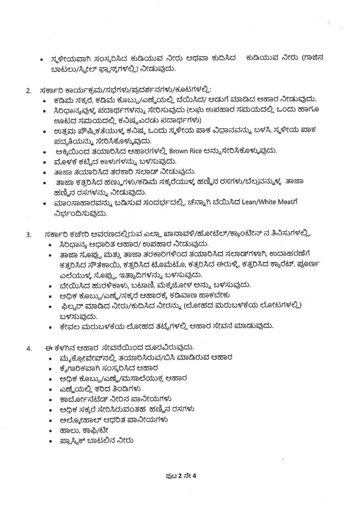 ವಿಶೇಷ ಸೂಚನೆಗಳು: ಊಟದ ವ್ಯವಸ್ಥೆ ಇರುವ ಕಾರ್ಯಕ್ರಮಗಳಲ್ಲಿ ಕನಿಷ್ಠ ಎರಡು ಸಿರಿಧಾನ್ಯದ ಪದಾರ್ಥಗಳು ಇರಬೇಕು ಹಾಗೂ ಬಿಳಿ ಅಕ್ಕಿಯ ಬದಲಿಗೆ ‘ಬ್ರೌನ್ ರೈಸ್’ ಬಳಸಲು ಸೂಚಿಸಲಾಗಿದೆ. ಅಲ್ಲದೆ, ಸ್ಥಳೀಯ ಪಾಕ ಪದ್ಧತಿ ಮತ್ತು ಸ್ಥಳೀಯ ಸಣ್ಣ ಕೈಗಾರಿಕೆಗಳು ಅಥವಾ ಸ್ವಸಹಾಯ ಸಂಘಗಳು ತಯಾರಿಸಿದ ಆಹಾರಕ್ಕೆ ಆದ್ಯತೆ ನೀಡಬೇಕು. ಆಹಾರವನ್ನು ಕೇವಲ ಮರುಬಳಕೆ ಮಾಡಬಹುದಾದ ಲೋಹದ ತಟ್ಟೆ ಮತ್ತು ಲೋಟಗಳಲ್ಲಿಯೇ ನೀಡಬೇಕು ಎಂದು ಮಾರ್ಗಸೂಚಿಯಲ್ಲಿ ತಿಳಿಸಲಾಗಿದೆ.