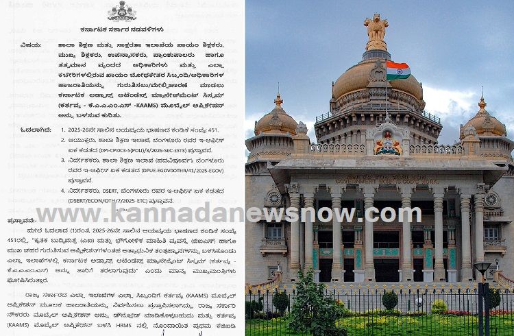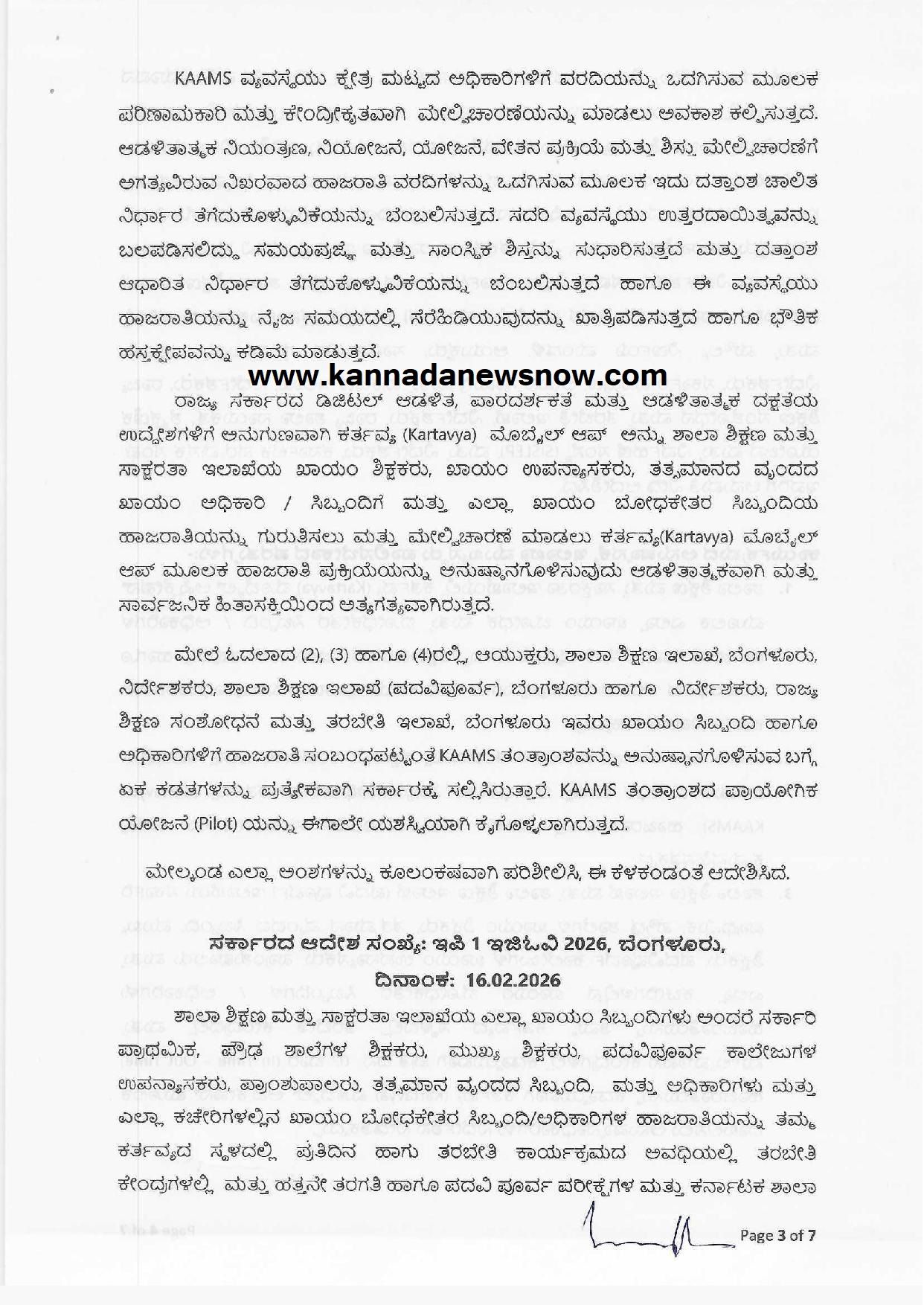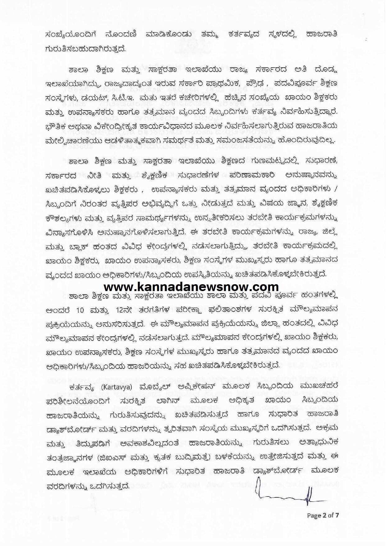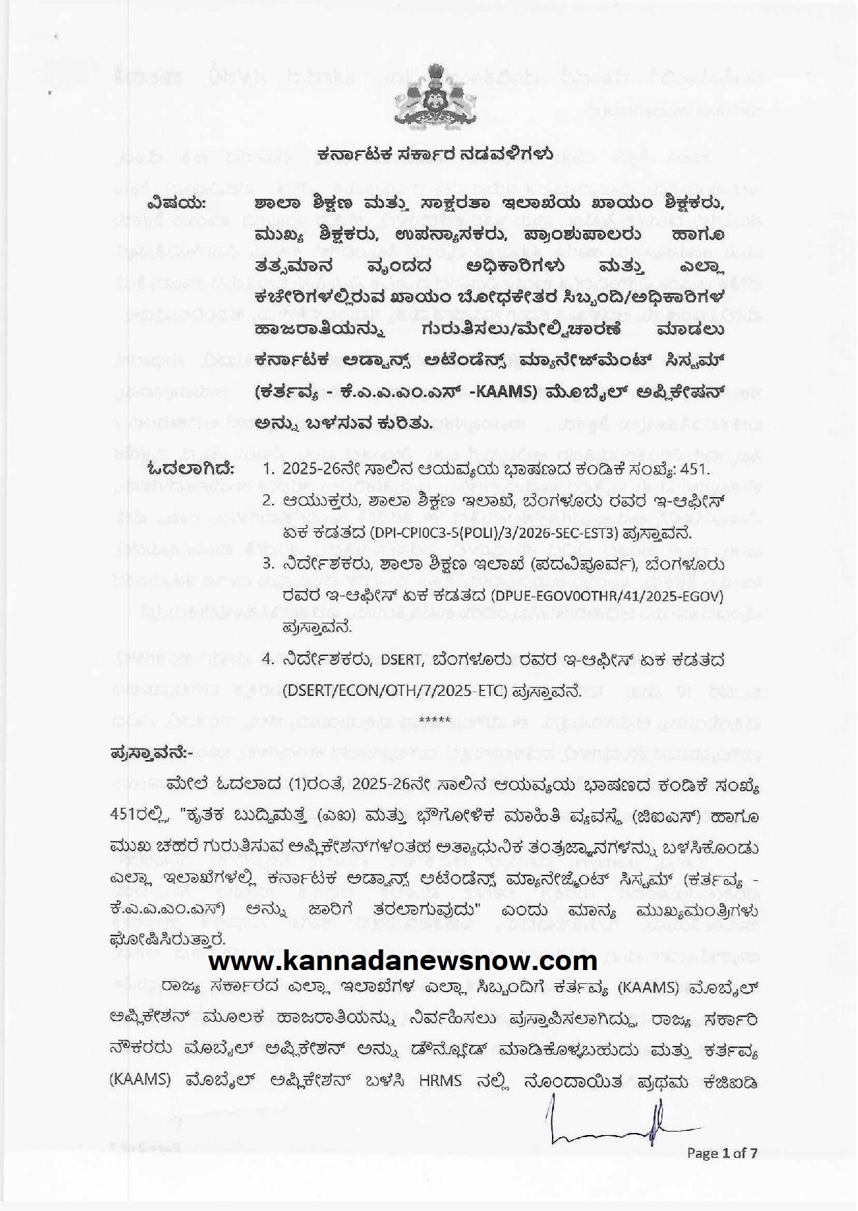 ಶಾಲಾ ಶಿಕ್ಷಣ ಮತ್ತು ಸಾಕ್ಷರತಾ ಇಲಾಖೆಯ ಎಲ್ಲಾ ಖಾಯಂ ಸಿಬ್ಬಂದಿಗಳು ಅಂದರೆ ಸರ್ಕಾರಿ ಪ್ರಾಥಮಿಕ, ಪ್ರೌಢ ಶಾಲೆಗಳ ಶಿಕ್ಷಕರು, ಮುಖ್ಯ ಶಿಕ್ಷಕರು, ಪದವಿಪೂರ್ವ ಕಾಲೇಜುಗಳ ಉಪನ್ಯಾಸಕರು, ಪ್ರಾಂಶುಪಾಲರು, ತತ್ಸಮಾನ ವೃಂದದ ಸಿಬ್ಬಂದಿ, ಮತ್ತು ಅಧಿಕಾರಿಗಳು ಮತ್ತು ಎಲ್ಲಾ ಕಚೇರಿಗಳಲ್ಲಿನ ಖಾಯಂ ಬೋಧಕೇತರ ಸಿಬ್ಬಂದಿ/ಅಧಿಕಾರಿಗಳ ಹಾಜರಾತಿಯನ್ನು ತಮ್ಮ ಕರ್ತವ್ಯದ ಸ್ಥಳದಲ್ಲಿ ಪ್ರತಿದಿನ ಹಾಗು ತರಬೇತಿ ಕಾರ್ಯಕ್ರಮದ ಅವಧಿಯಲ್ಲಿ ತರಬೇತಿ ಕೇಂದ್ರಗಳಲ್ಲಿ ಮತ್ತು ಹತ್ತನೇ ತರಗತಿ ಹಾಗೂ ಪದವಿ ಪೂರ್ವ ಪರೀಕ್ಷೆಗಳ ಮತ್ತು ಕರ್ನಾಟಕ ಶಾಲಾ ಪರೀಕ್ಷೆ ಮತ್ತು ಮೌಲ್ಯ ನಿರ್ಣಯ ಮಂಡಳಿ ಇಂದ ನಡೆಸುವ ಎಲ್ಲಾ ಪರೀಕ್ಷೆಗಳ ಮೌಲ್ಯಮಾಪನ ಕೇಂದ್ರಗಳಲ್ಲಿ ಕಡ್ಡಾಯವಾಗಿ ಗುರುತಿಸಲು ಹಾಗೂ ಎಲ್ಲಾ ಸಹ ಇಲಾಖೆಗಳಲ್ಲಿ ಖಾಯಂ ಸಿಬ್ಬಂದಿಯ ಹಾಜರಾತಿ ದತ್ತಾಂಶದ ಏಕರೂಪತೆ, ಪಾರದರ್ಶಕತೆ ಮತ್ತು ಪರಿಶೀಲನೀಯತೆಯನ್ನು ಖಾತ್ರಿಪಡಿಸುವ ಸಂಬಂಧ ಕರ್ನಾಟಕ ಅಡ್ಯಾನ್ಸ್ ಅಟೆಂಡೆನ್ಸ್ ಮ್ಯಾನೇಜ್ಮೆಂಟ್ ಸಿಸ್ಟಮ್ ಕರ್ತವ್ಯ Kartavya – KAAMS) ಮೊಬೈಲ್ ಅಪ್ಲಿಕೇಷನ್ ಅನ್ನು ತಕ್ಷಣದಿಂದ ಕಡ್ಡಾಯವಾಗಿ ಜಾರಿಗೊಳಿಸಲು ಆಯುಕ್ತರು, ಶಾಲಾ ಶಿಕ್ಷಣ ಇಲಾಖೆ, ನಿರ್ದೇಶಕರು, ಶಾಲಾ ಶಿಕ್ಷಣ ಇಲಾಖೆ (ಪದವಿ ಪೂರ್ವ), ರಾಜ್ಯ ಯೋಜನಾ ನಿರ್ದೇಶಕರು, ಸಮಗ್ರ ಶಿಕ್ಷಣ ಕರ್ನಾಟಕ, ಅವರ ಆಯುಕ್ತರು, ಶಾಲಾ ಶಿಕ್ಷಣ ಇಲಾಖೆ (ಕಲಬುರ್ಗಿ / ಧಾರವಾಡ ಇವರ ವ್ಯಾಪ್ತಿಗೆ ಒಳಪಡುವು ಅಧ್ಯಕ್ಷರು, ಕರ್ನಾಟಕ ಶಾಲಾ ಪರೀಕ್ಷೆ ಮತ್ತು ಮೌಲ್ಯ ನಿರ್ಣಯ ಮಂಡಳಿ, ಆಯುಕ್ತರು, ಸಾರ್ವಜನಿಕ ಗ್ರಂಥಾಲಯ ಇಲಾಖೆ, ನಿರ್ದೇಶಕರು, ಸರ್ಕಾರಿ ಮುದ್ರಣ, ಲೇಖನ ಸಾಮಗ್ರಿ ಮತ್ತು ಪ್ರಕಟಣೆ ಇಲಾಖೆ, ನಿರ್ದೇಶಕರು, ರಾಜ್ಯ ಶಿಕ್ಷಣ ಸಂಶೋಧನೆ ಮತ್ತು ತರಬೇತಿ ಇಲಾಖೆ, ನಿರ್ದೇಶಕರು, ರಾಜ್ಯ ಶಾಲಾ ನಾಯಕ ಶೈಕ್ಷಣಿಕ ಯೋಜನೆ ಮತ್ತು ನಿರ್ವಹಣೆ ಸಂಸ್ಥೆ (SISLEP), ಮತ್ತು ನಿರ್ದೇಶಕರು, ಕರ್ನಾಟಕ ಪಠ್ಯಪುಸ್ತಕ ಸಂಘ, ಇವರಿಗೆ ಅನುಮತಿ ನೀಡಿ ಆದೇಶಿಸಿದ.