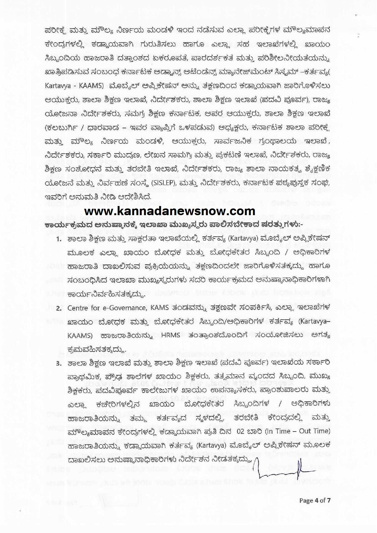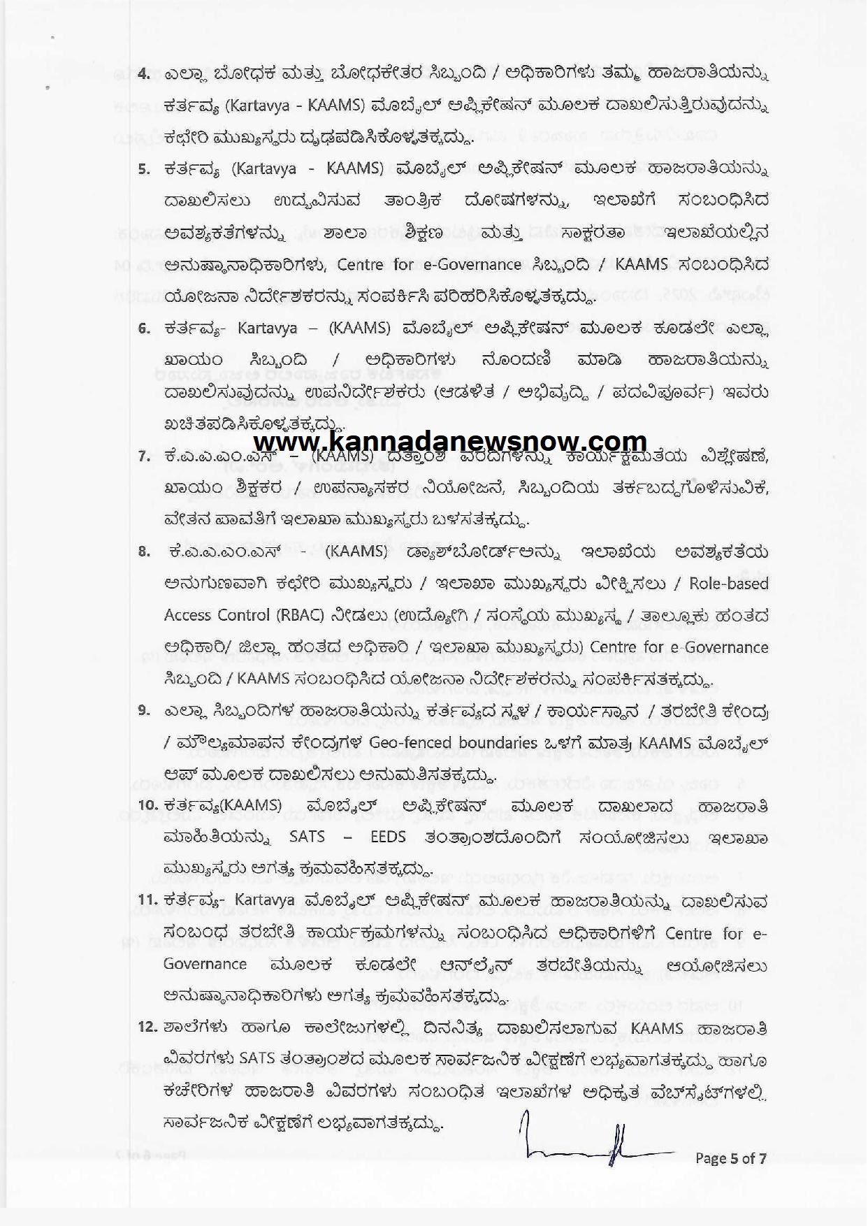 4, ಎಲ್ಲಾ ಬೋಧಕ ಮತ್ತು ಬೋಧಕೇತರ ಸಿಬ್ಬಂದಿ / ಅಧಿಕಾರಿಗಳು ತಮ್ಮ ಹಾಜರಾತಿಯನ್ನು ಕರ್ತವ್ಯ (Kartavya – KAAMS) ಮೊಬೈಲ್ ಅಪ್ಲಿಕೇಷನ್ ಮೂಲಕ ದಾಖಲಿಸುತ್ತಿರುವುದನ್ನು ಕಛೇರಿ ಮುಖ್ಯಸ್ಥರು ದೃಢವಡಿಸಿಕೊಳ್ಳತಕ್ಕದ್ದು.