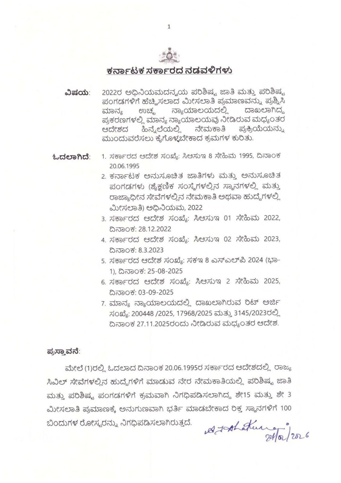 ಪರಿಶಿಷ್ಟ ಜಾತಿ (SC) ಮತ್ತು ಪರಿಶಿಷ್ಟ ಪಂಗಡಗಳ (ST) ಮೀಸಲಾತಿ ಪ್ರಮಾಣವನ್ನು ಹೆಚ್ಚಿಸಿ 2022ರಲ್ಲಿ ತರಲಾಗಿದ್ದ ಕಾಯ್ದೆಯನ್ನು ಪ್ರಶ್ನಿಸಿ ಹೈಕೋರ್ಟ್ನಲ್ಲಿ ಅರ್ಜಿ ಸಲ್ಲಿಕೆಯಾಗಿತ್ತು. ಈ ಹಿನ್ನೆಲೆಯಲ್ಲಿ ನವೆಂಬರ್ 27, 2025 ರಂದು ಮಧ್ಯಂತರ ಆದೇಶ ನೀಡಿದ್ದ ಮಾನ್ಯ ಉಚ್ಚ ನ್ಯಾಯಾಲಯವು, ಹೆಚ್ಚಿಸಿದ ಮೀಸಲಾತಿ ಆಧಾರದ ಮೇಲೆ ಹೊಸ ನೇಮಕಾತಿ ಅಧಿಸೂಚನೆ ಹೊರಡಿಸದಂತೆ ತಡೆ ನೀಡಿತ್ತು. ಇದರಿಂದಾಗಿ ರಾಜ್ಯದಲ್ಲಿ ನೇಮಕಾತಿ ಪ್ರಕ್ರಿಯೆಗಳು ಸಂಪೂರ್ಣವಾಗಿ ಸ್ಥಗಿತಗೊಂಡಿದ್ದವು. ಇದೀಗ ಸಿಬ್ಬಂದಿ ಮತ್ತು ಆಡಳಿತ ಸುಧಾರಣೆ ಇಲಾಖೆ (DPAR) ಫೆಬ್ರವರಿ 27, 2026 ರಂದು ಹೊಸ ಆದೇಶ (ಸಂಖ್ಯೆ: ಸಿಆಸುಇ 01 ಸೇಹಿಮ 2026) ಹೊರಡಿಸುವ ಮೂಲಕ ಈ ಕಾನೂನು ತೊಡಕಿಗೆ ತಾತ್ಕಾಲಿಕ ಪರಿಹಾರ ಕಂಡುಕೊಂಡಿದೆ.