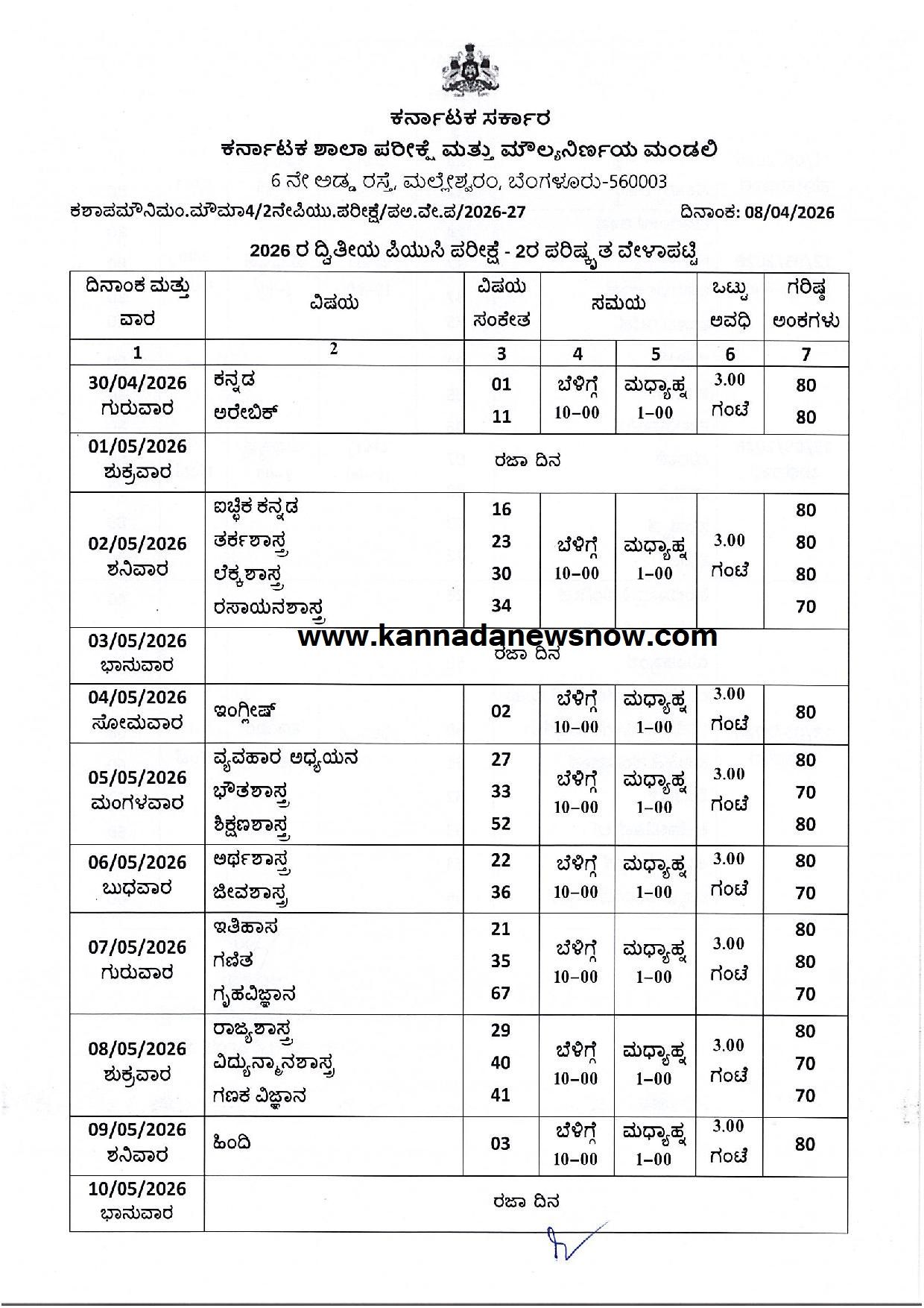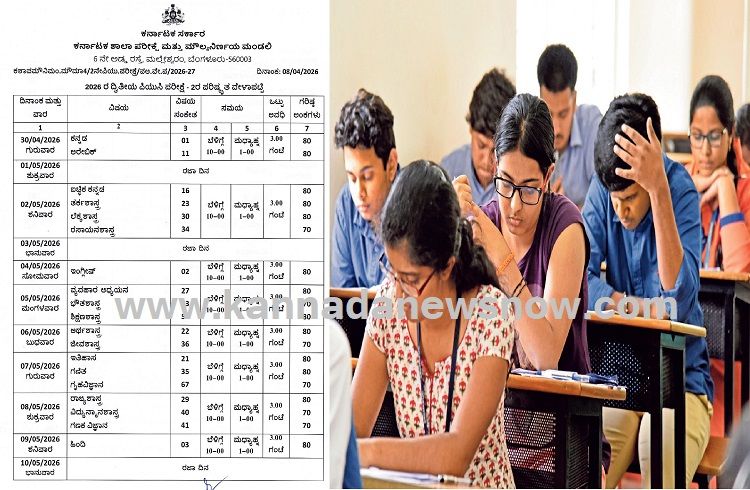 ಬೆಂಗಳೂರು: ಕರ್ನಾಟಕ ಶಾಲಾ ಪರೀಕ್ಷೆ ಮತ್ತು ಮೌಲ್ಯನಿರ್ಣಯ ಮಂಡಲಿಯು 2026ರ ದ್ವಿತೀಯ ಪಿಯುಸಿ ಪರೀಕ್ಷೆ-2ರ ಪರಿಷ್ಕೃತ ವೇಳಾಪಟ್ಟಿಯನ್ನು ಅಧಿಕೃತವಾಗಿ ಪ್ರಕಟಿಸಿದೆ. ದಿನಾಂಕ 08/04/2026 ರಂದು ಬಿಡುಗಡೆಯಾದ ಈ ಹೊಸ ವೇಳಾಪಟ್ಟಿಯ ಪ್ರಕಾರ, ಏಪ್ರಿಲ್ 30ರಿಂದ ಪರೀಕ್ಷೆಗಳು ಆರಂಭವಾಗಲಿವೆ.