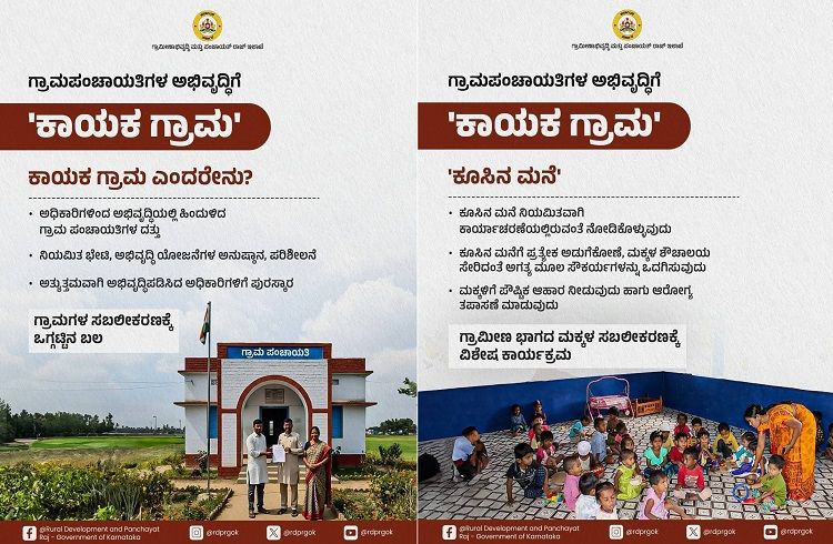ಬೆಂಗಳೂರು : ಗ್ರಾಮ ಪಂಚಾಯತಿಗಳ ಸಮಗ್ರ ಅಭಿವೃದ್ಧಿಗಾಗಿ ‘ಕಾಯಕ ಗ್ರಾಮ’ ಕಾರ್ಯಕ್ರಮ ಜಾರಿಯಾಗಿದ್ದು,ಈ ಕಾರ್ಯಕ್ರಮದಡಿ ಅಧಿಕಾರಿಗಳು ಪಂಚಾಯತಿಗಳನ್ನು ದತ್ತು ಪಡೆದು ಅಭಿವೃದ್ಧಿಪಡಿಸಲಿದ್ದಾರೆ. ಅತ್ಯುತ್ತಮವಾಗಿ ಅಭಿವೃದ್ಧಿಪಡಿಸಿದ ಅಧಿಕಾರಿಗಳಿಗೆ ಪುರಸ್ಕಾರ ಲಭಿಸಲಿದೆ.