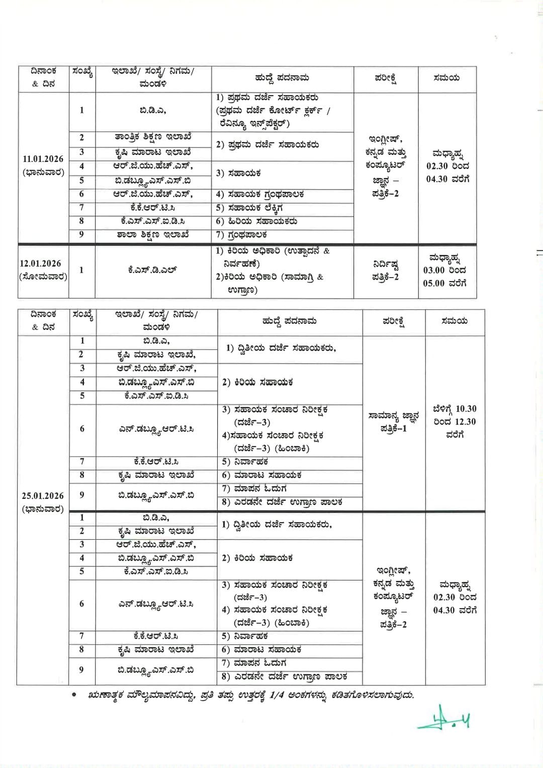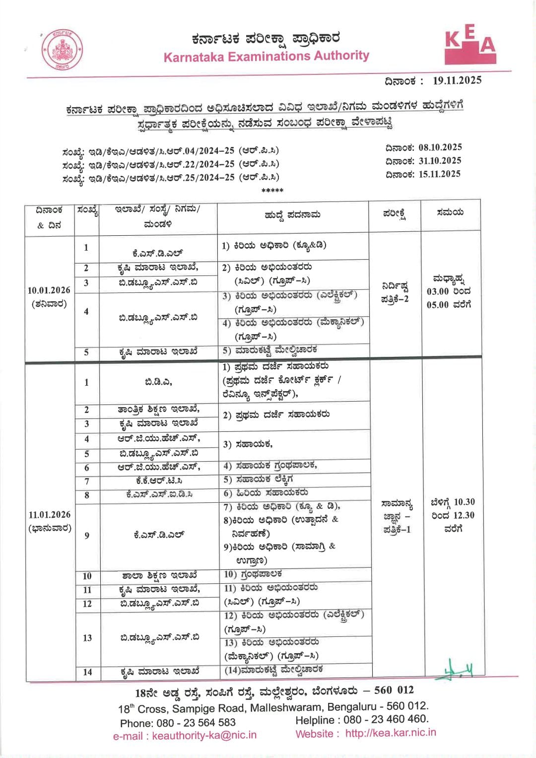 ತಾಂತ್ರಿಕ ಶಿಕ್ಷಣ, ಕೃಷಿ ಮಾರಾಟ, ಬಿಡಿಎ, ಬೆಂಗಳೂರು ಜಲಮಂಡಳಿ, ಕೆಎಸ್ ಡಿ ಎಲ್, ಕೆಕೆಆರ್ ಟಿಸಿ, ಆರ್ ಜಿಯುಎಚ್ಎಸ್, ಕೆಎಸ್ಎಸ್ಐಡಿಸಿ, ಶಾಲಾ ಶಿಕ್ಷಣ ಇತ್ಯಾದಿ ಇಲಾಖೆ/ನಿಗಮ- ಮಂಡಳಿಗಳ ವಿವಿಧ ದರ್ಜೆಯ ಹುದ್ದೆಗಳಿಗೆ ಪರೀಕ್ಷೆ ನಡೆಸಲಾಗುತ್ತದೆ ಎಂದು ಅವರು ವಿವರಿಸಿದ್ದಾರೆ.