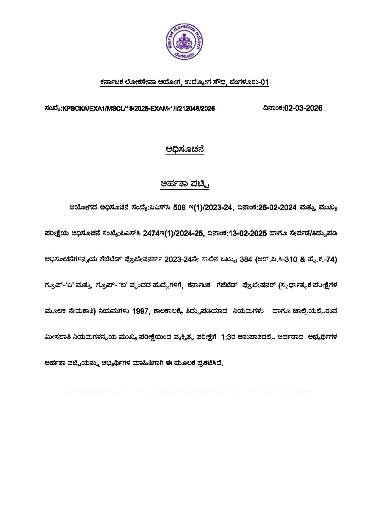 ಬೆಂಗಳೂರು: ಕರ್ನಾಟಕ ಲೋಕಸೇವಾ ಆಯೋಗವು (KPSC) ಗೆಜೆಟೆಡ್‌ ಪ್ರೊಬೇಷನರಿ ಗ್ರೂಪ್‌ ‘ಎ’ ಮತ್ತು ಗ್ರೂಪ್‌ ‘ಬಿ’ ವೃಂದದ ಒಟ್ಟು 384 ಹುದ್ದೆಗಳ ನೇಮಕಾತಿಗೆ ಸಂಬಂಧಿಸಿದಂತೆ ಮುಖ್ಯ ಪರೀಕ್ಷೆಯ ಫಲಿತಾಂಶವನ್ನು ಸೋಮವಾರ ಪ್ರಕಟಿಸಿದೆ. ಅರ್ಹತೆ ಪಡೆದ ಅಭ್ಯರ್ಥಿಗಳನ್ನು 1:3 ಅನುಪಾತದ ಆಧಾರದ ಮೇಲೆ ವ್ಯಕ್ತಿತ್ವ ಪರೀಕ್ಷೆಗೆ (ಸಂದರ್ಶನ) ಆಯ್ಕೆ ಮಾಡಲಾಗಿದೆ.